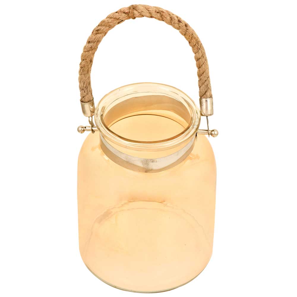 These hThese handmade Glass candle holders are made of clear glass with a metal band that holds the rope handle .Fill it with a pillar candle, tea lights or small votive candles to make a big impact on your room's decor. Create a lovely ambience for your guests at dinner, parties housewarmings and many more with these luxurious glass lantern.