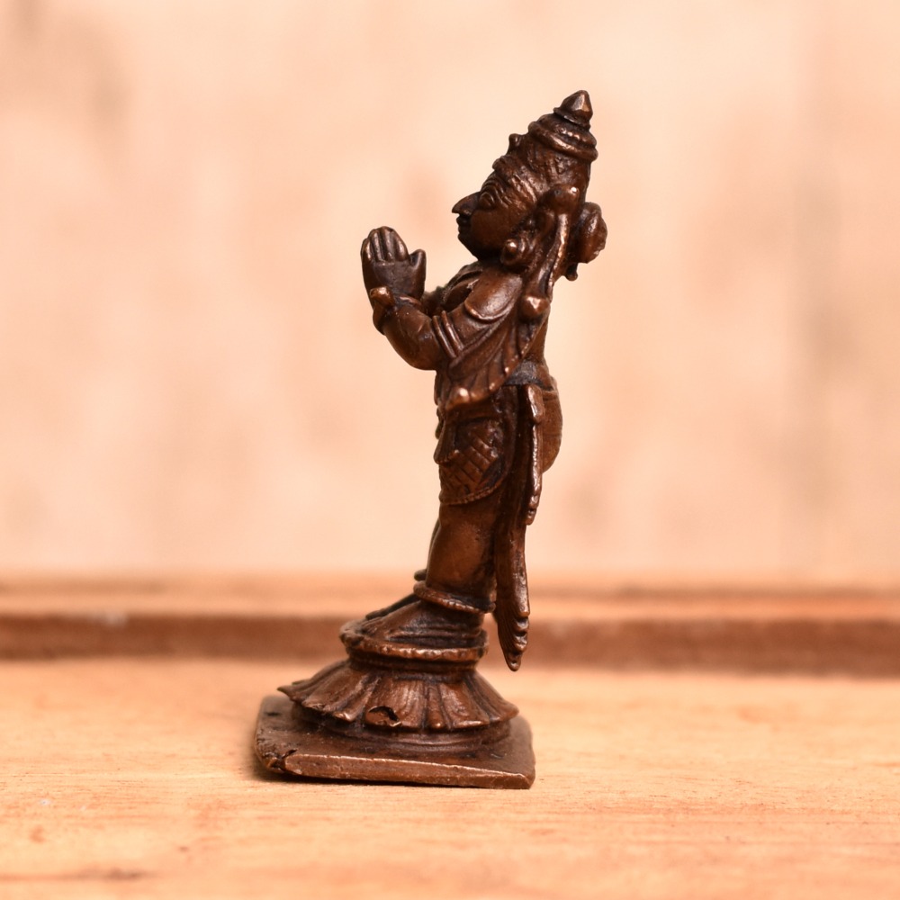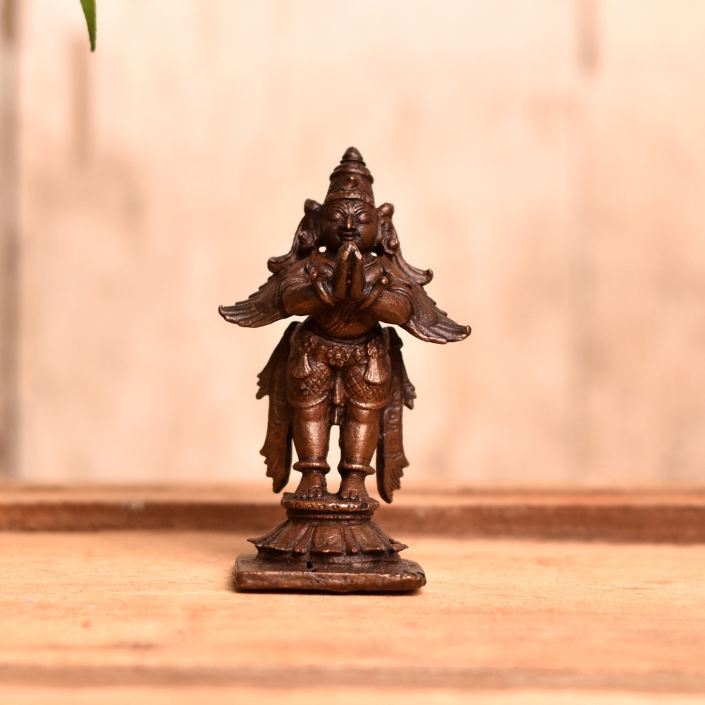 This beautiful Lord Garuda Copper statue is a stunning representation of the revered Hindu deity, Lord Garuda. The statue is exquisitely crafted by skilled Indian artisans, with intricate details that capture the essence of Lord Garuda in Namaskar Mudra. The statue is made entirely of copper, which is a highly auspicious metal in India and is worshipped in many temples across the country. The Lord Garuda Copper statue is a perfect addition to any prayer room at home, office, restaurant, hotel, cafe, or shop. It is a powerful symbol of devotion and worship and is known to bring positive energy and good fortune to its surroundings. The statue is also a perfect gift for your loved ones on special or festive occasions such as weddings, housewarmings, or religious festivals. It can be easily bought online, making it accessible to anyone across the world. In Hindu mythology, Lord Garuda is considered to be the king of birds and the mount of Lord Vishnu. This Lord Garuda statue is a magnificent representation of this revered deity and is sure to inspire and bring peace to all who behold it.