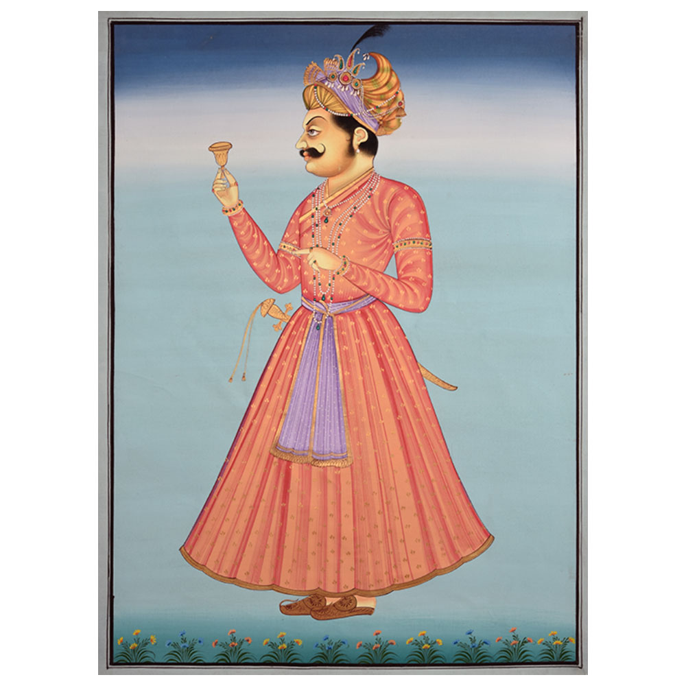 The rajashani artwork or painting of a dressed in traditional ornaments ruler or maharaja clutching a rose in the palace garden is widespread and captivating, bringing up images of glory and magnificence. The portrait artwork depicts the Maharajah as an ideal king, laden with diamonds and arms to represent his wealth and strength, while clutching a rose blossom to represent his sensitivity and gentleness. This Indian Maharajah miniature art, which is guaranteed to be a one-of-a-kind addition to your wall, mantel, or even your desk.