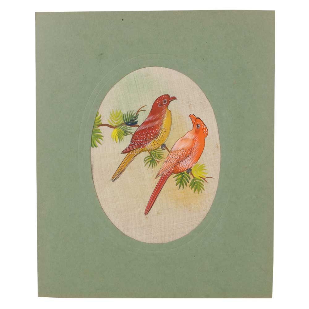 A beautiful hand painted portrait / painting on Art silk. Colorful picture of sparrows in sitting position on leafy branch of trees portrait painted in glowing acrylic and vegetable water colors. The colors extracted from certain minerals and plant sources.