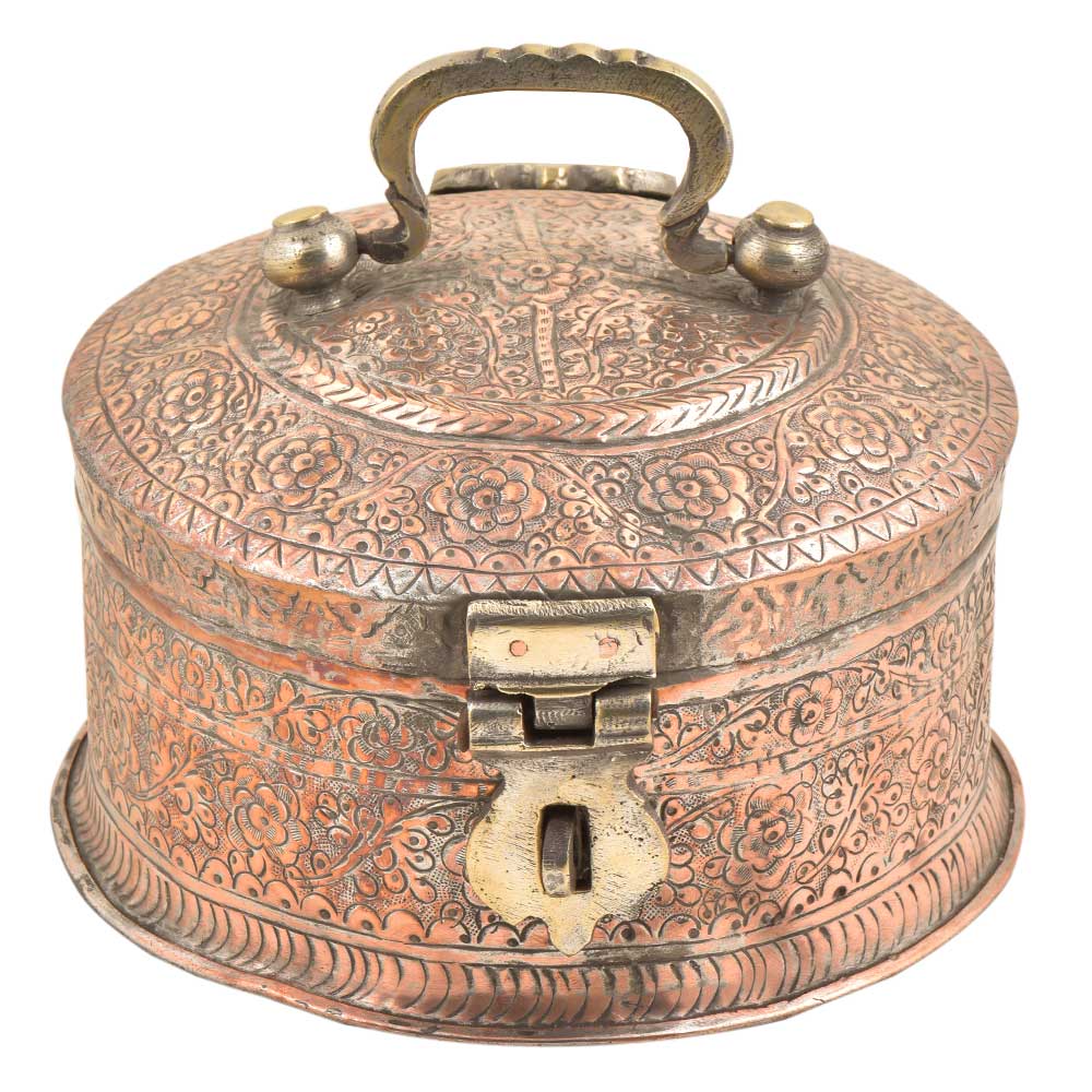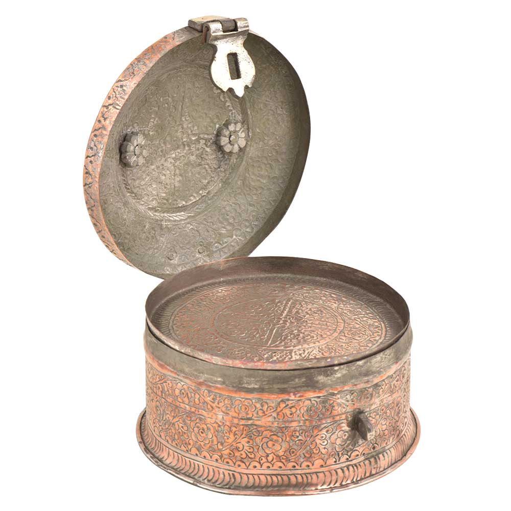 Hand Embossed Copper Betel Nut Pandan Box – with hand hammered floral and incised decoration used to store betel leaf, lime, tobacco and the nut from the areca palm. The practice of chewing betel nut was popular all over Asia and is still a common practice in Myanmar and India. This Pandan betel nut box contains six small pots, each incised on the tops and sides with the same design and metal.