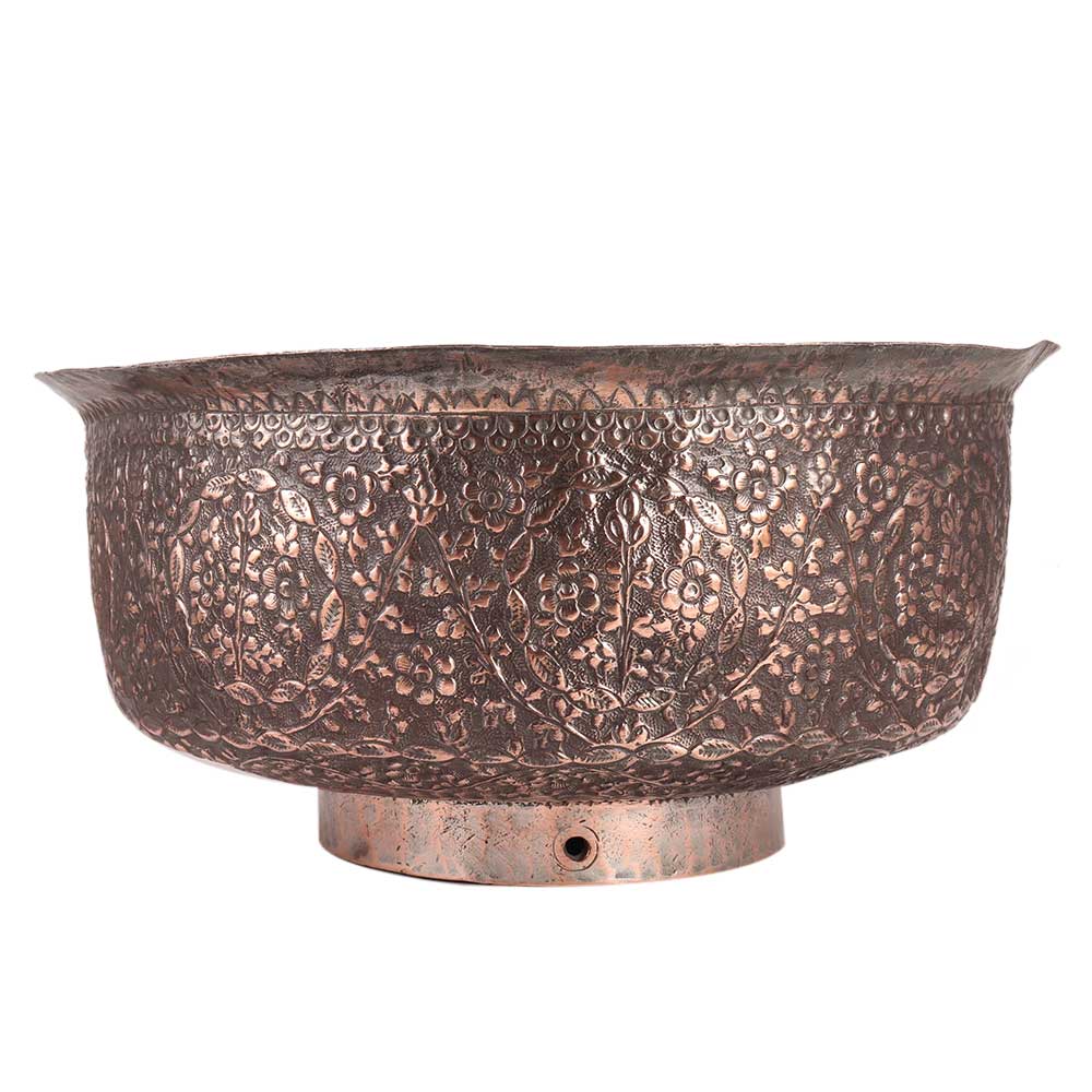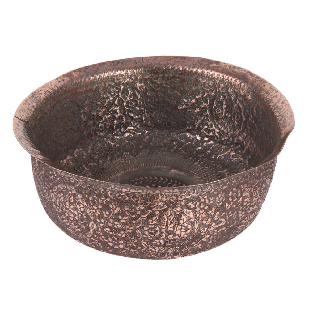 This attractively decorated kashmiri Indian Repousse Copper Antique Bowl is from India, most likely Kashmir, made by the local master craftsmen.using traditional designs and methods. It has an elaborately decorated sequence of stylized foliage with vines design to the base.