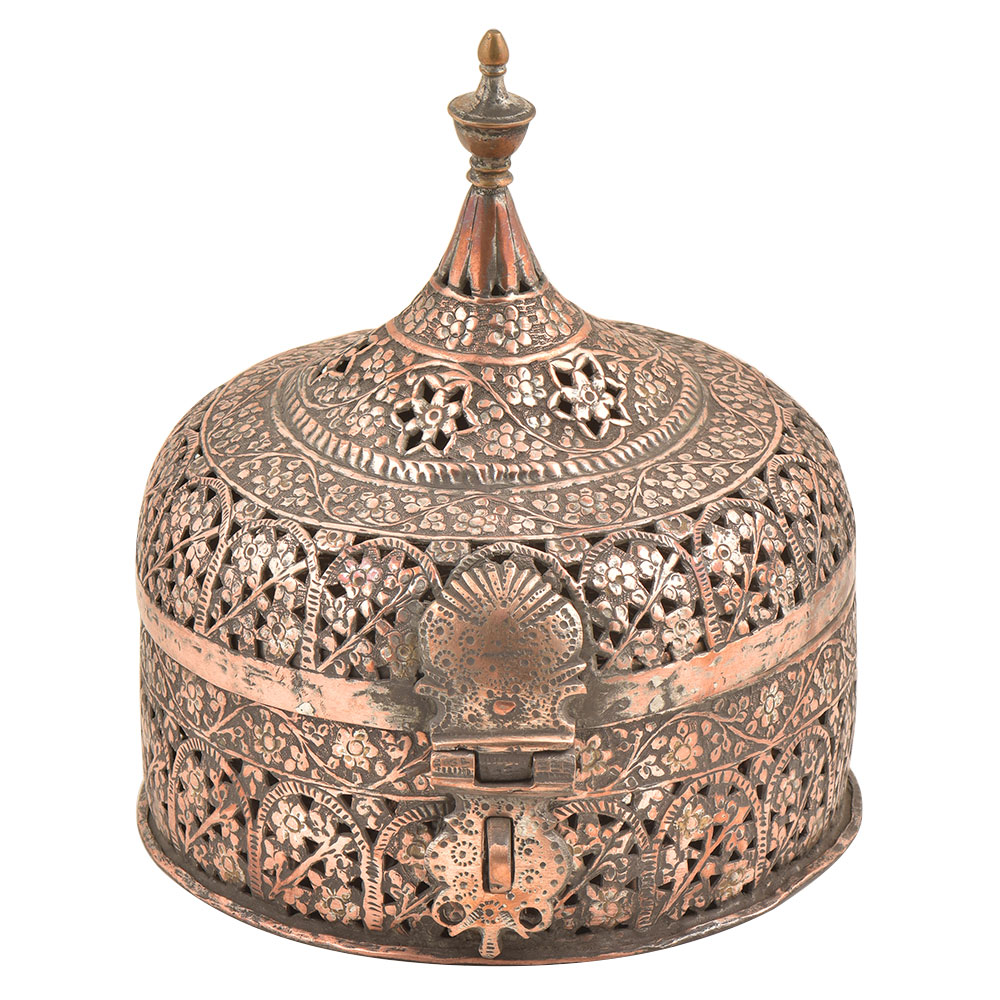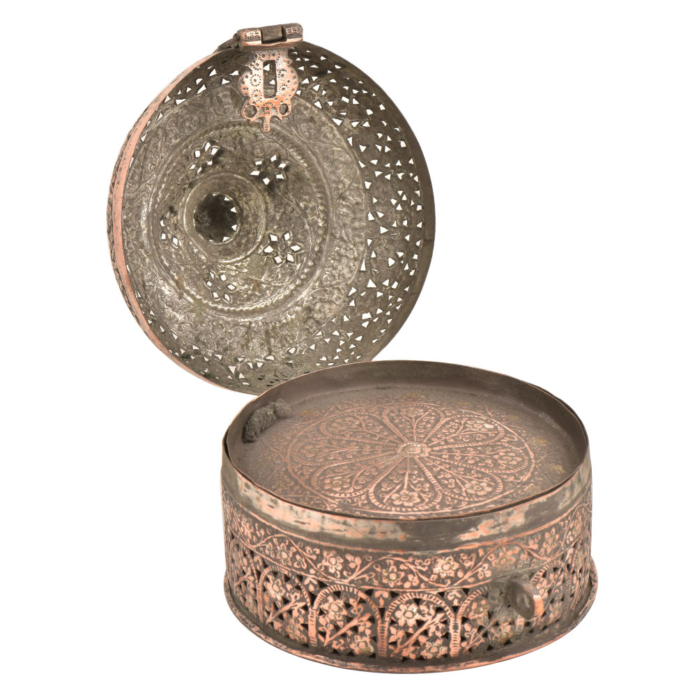 Hand Embossed Copper Betel Nut Pandan Box – with hand hammered floral and incised decoration used to store betel leaf, lime, tobacco and the nut from the areca palm. The practice of chewing betel nut was popular all over Asia and is still a common practice in Myanmar and India. This Pandan betel nut box contains six small pots, each incised on the tops and sides with the same design and metal.