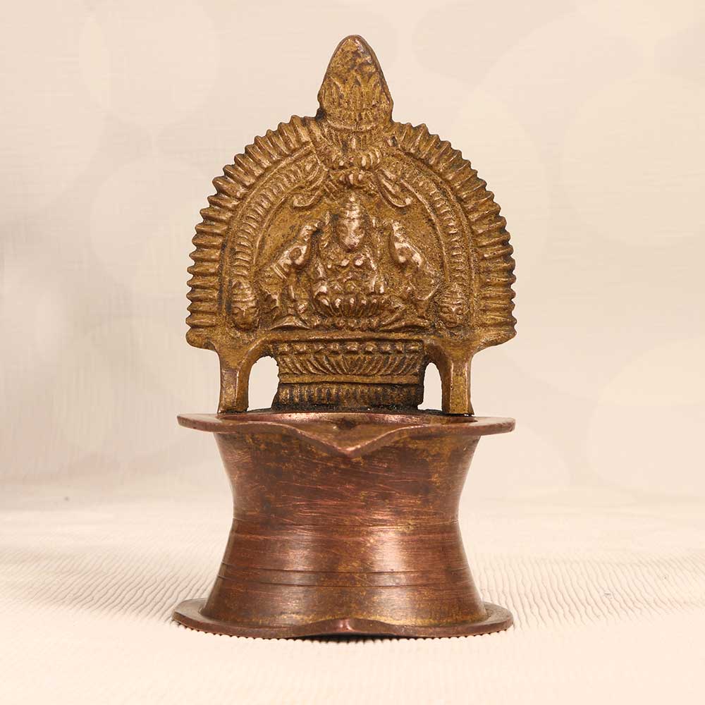 - Intricate brass lamp depicting traditional Hindu goddess motifs