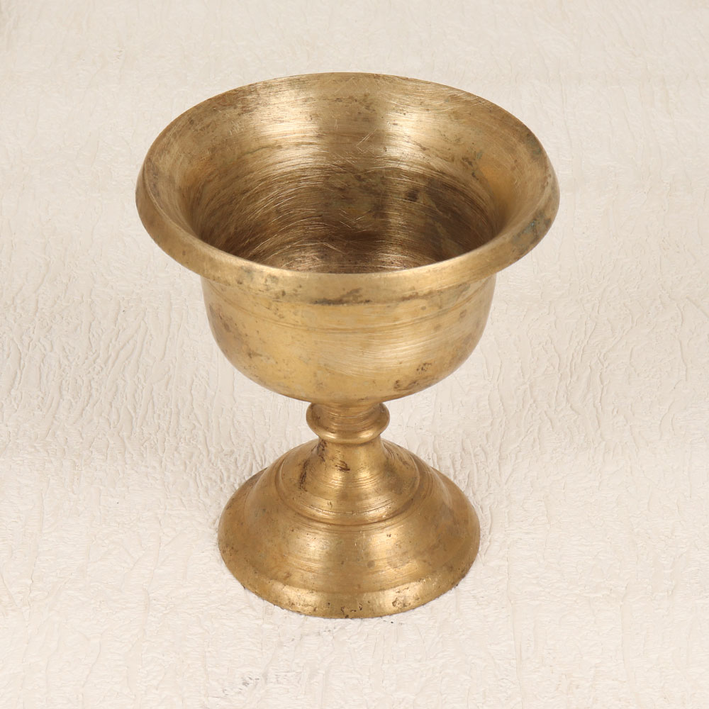 A Vintage Brass Kumkum Cup with Base Stand which is a timeless piece meticulously handcrafted by professional Indian artisans. This ceremonial accessory holds profound cultural significance, traditionally used during prayers, rituals, and havans to contain sacred kumkum tilak. Made from high-quality brass, its antique brown finish adds a touch of antiquity, reflecting the rich heritage of Indian craftsmanship. This ornate piece seamlessly blends functionality with aesthetics, making it a perfect addition to your home, office, restaurant, hotel, or cafe prayer room. Beyond its religious utility, this brass kumkum cup doubles as an elegant decorative item, lending an air of sophistication to any space. Its versatile design makes it an ideal choice for those seeking to enhance their vintage collection or to gift a cherished piece to your family, friends or relatives on special, festive, or auspicious occasions. Embrace the artistry and cultural resonance embodied in this handmade brass kumkum cup, a testament to the enduring craftsmanship and devotion of Indian artisans. Whether used in rituals, as a decor element, or as a thoughtful gift, this vintage piece transcends time, connecting the past with the present in a celebration of spirituality and tradition.
