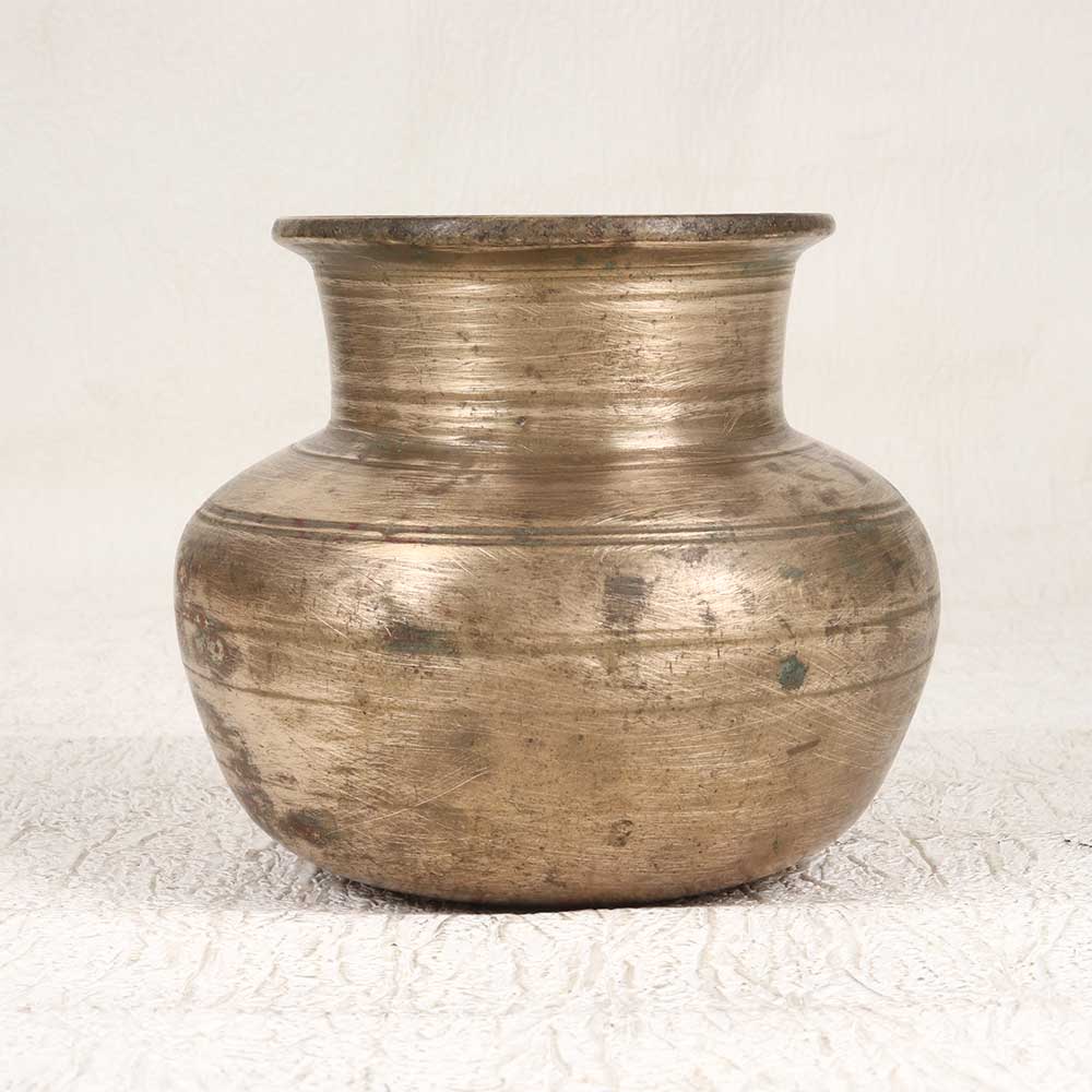 Step back in time with this antique brass pot handcrafted in Gujarat. The vintage patina and hammered texture give this pot an aged quality that feels straight out of the past. Display your favorite blooms in this brass pot to add an antique touch to your porch, patio or entryway. The aged patina develops a deeper, more unique color over time, becoming an even more special decorative piece. Its timeworn styling gives any space an old-world, vintage feel. For antique lovers and vintage design fans, this brass pot is a special find. The hammered detailing and patina make each pot one-of-a-kind. Bring the style of past eras into your home with this gorgeous vintage brass pot, perfect for flowers or standalone decor.