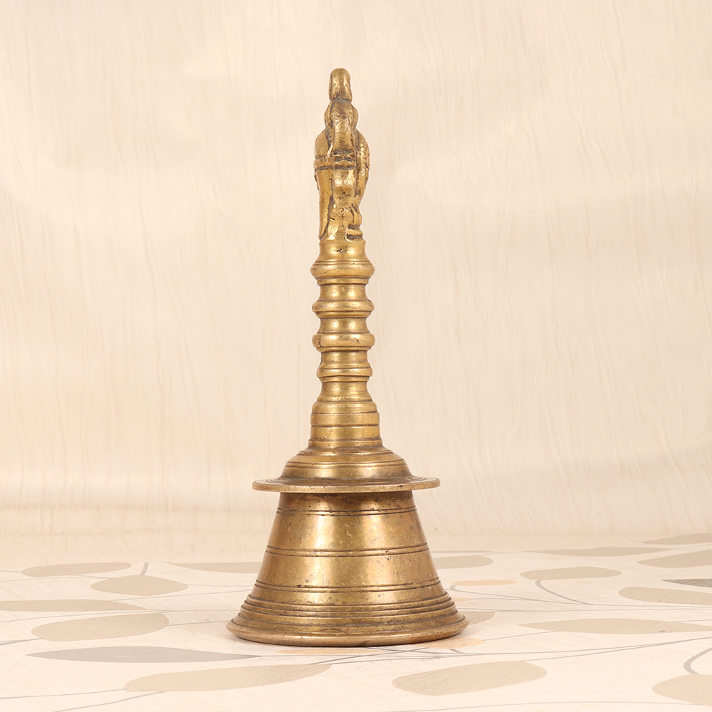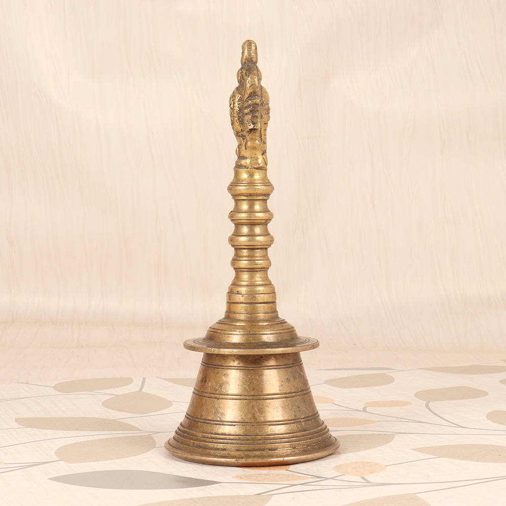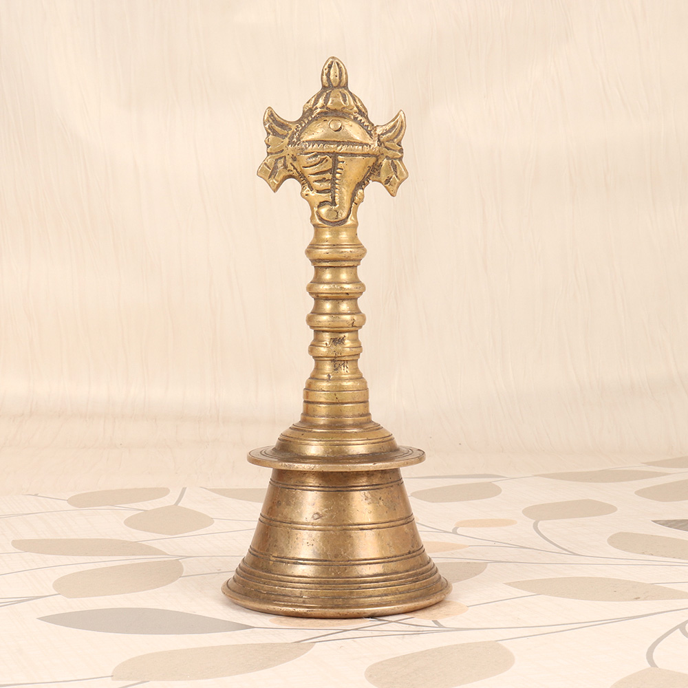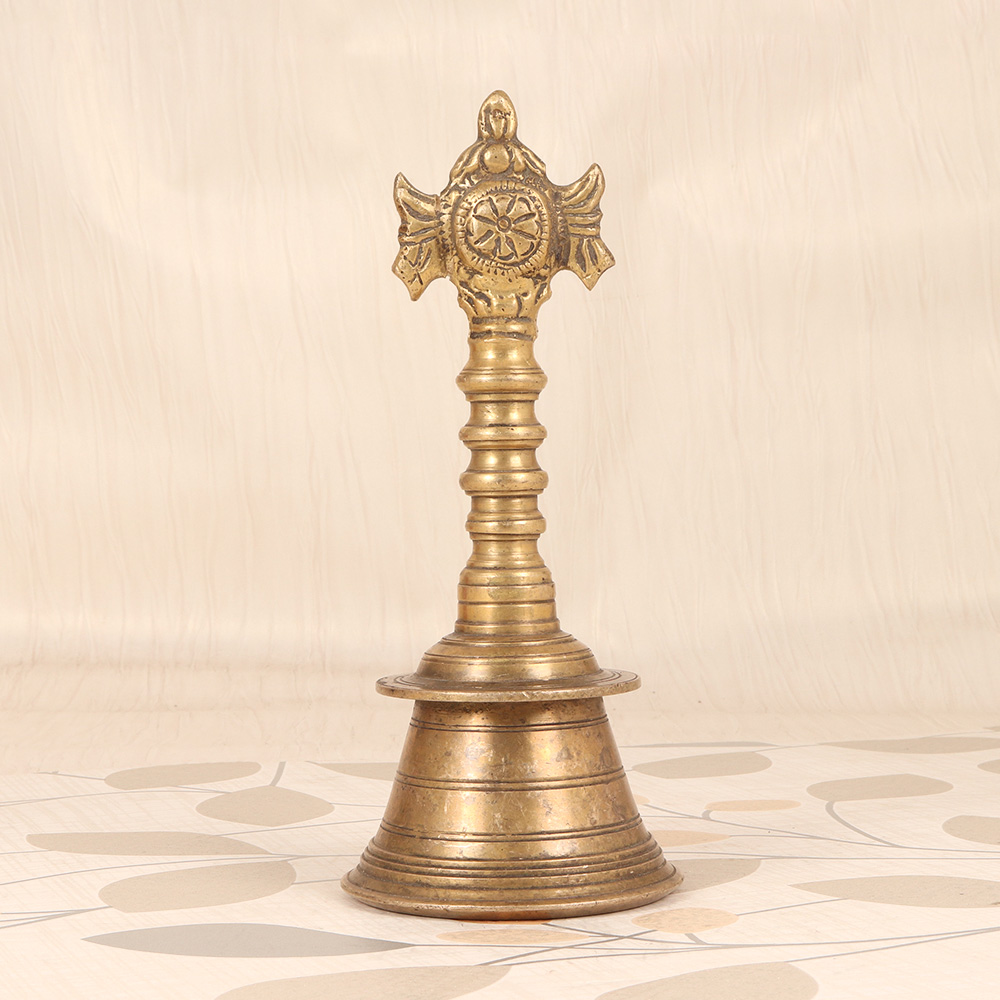 Immerse yourself in the captivating world of traditional Indian spirituality with this exquisite vintage brass temple bell. Meticulously handcrafted in the renowned Karnataka style, this bell is a true work of art, featuring the iconic Lord Vishnu Chakra - a symbol of the divine energy that permeates the universe. When struck, the bell emits a deeply resonant tone that instantly soothes the senses and focuses the mind, making it an indispensable tool for meditation, yoga, and personal reflection. Crafted from durable brass, this temple bell is built to last, with a sturdy handle that allows you to easily ring it during your daily rituals and ceremonies. This temple bell is the perfect size to display proudly in your home, office, or meditation space, serving as a beautiful reminder to slow down, breathe, and connect with the present moment. Whether you're an experienced spiritual practitioner or simply someone in search of a little more tranquility in your life, this captivating brass bell will transport you to a state of profound inner harmony.