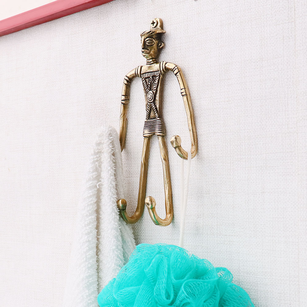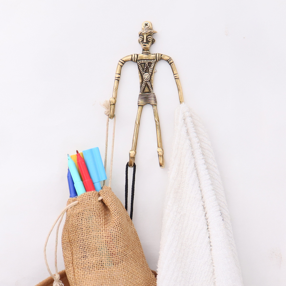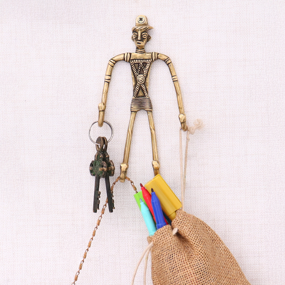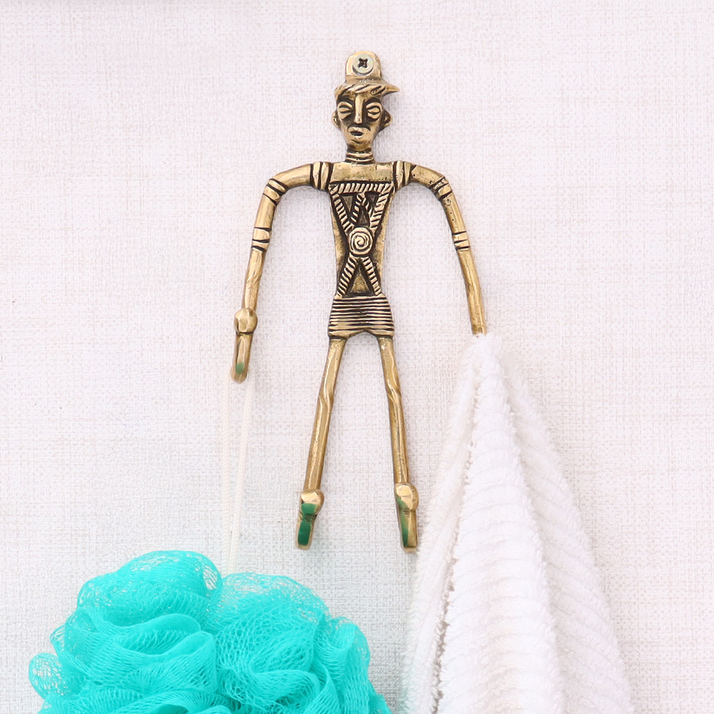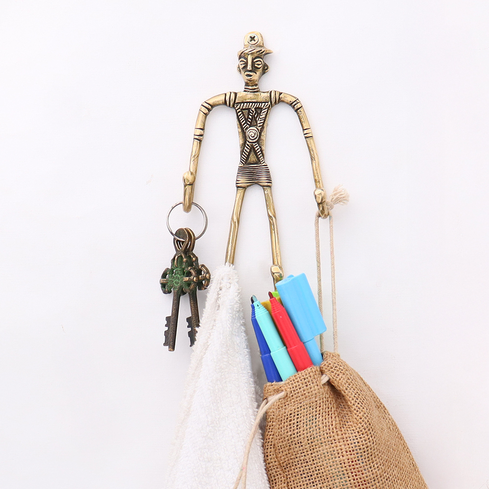 Indian Tribal Cast Brass Wall Hook Man Figurine. When Put on Wall or Cabinet It is An Art in Itself. Its A Mix of French and English Design. Suitable for Your Kitchen, Cupboard, Rooms, Cabinets, Almirahs, Bathrooms, Doors, Etc.