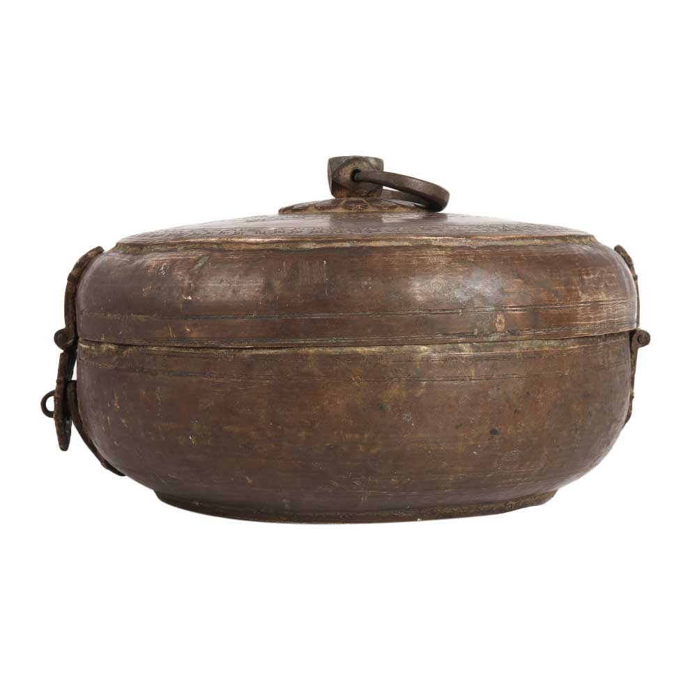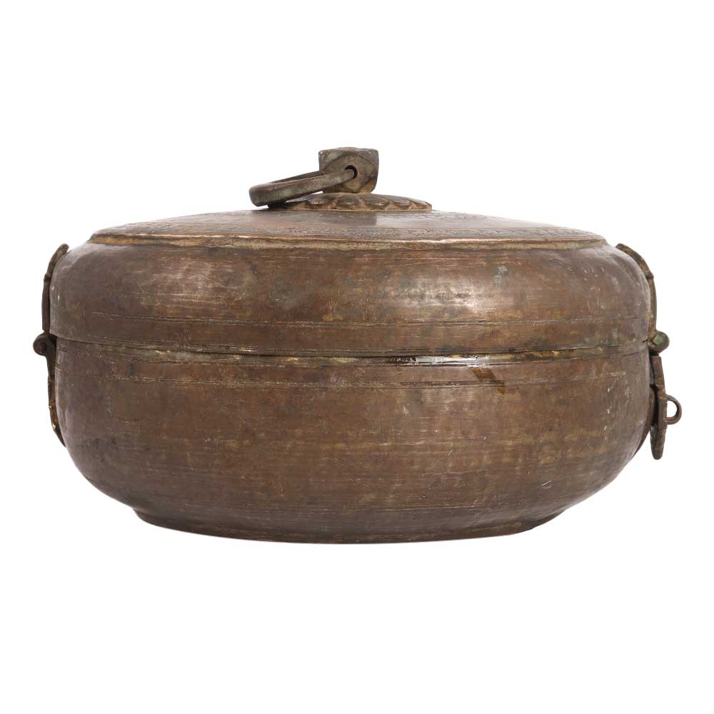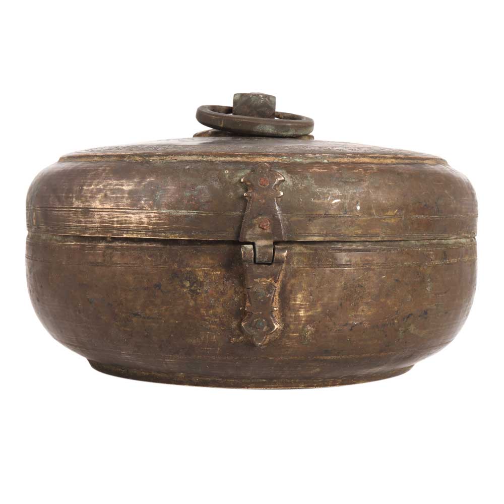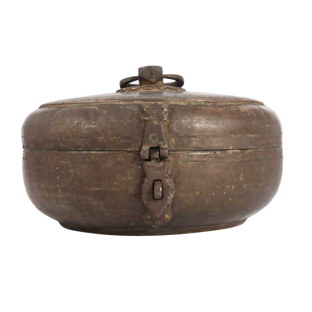 A Vintage Indian box used to store chapati. It has an elegant brown finish with carvings on the top. This sturdy box has a latch and a ring handle on the top. Use this box to store small items in your home, restaurant, hotel or shop. It will add a touch of vintage style to the interior of the restaurant or hotel. As it is made of high quality brass, it leaves a long lasting impression on the interior design. This box is handmade by skilled Indian artisans in Rajasthani art using ancient methods. Buy this handmade vintage box online and catch the eyes of your visitors and guests in your home or restaurant. An ideal gift for your loved ones for special and festive occasion.