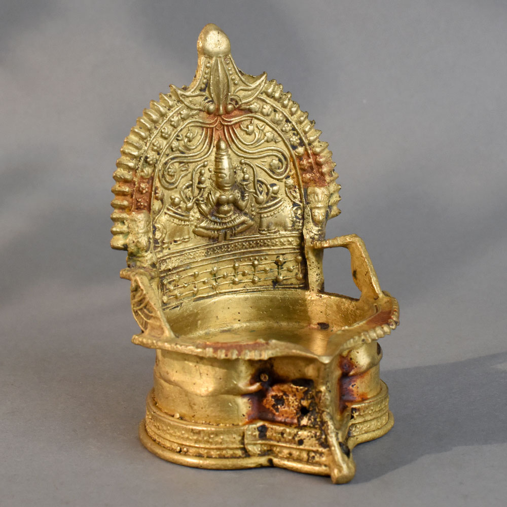 This vintage handmade brass pooja diya embodies the beauty of traditional South Indian artistry. Featuring a temple-style design with a divine carving at the backplate, it reflects cultural richness and devotion. The diya is crafted in solid brass with intricate detailing that showcases the skill of traditional artisans. Its antique finish adds a heritage charm, making it both a functional diya for worship and a decorative collectible. Perfect for lighting during pooja, meditation, or festive rituals, this diya radiates positivity and spiritual energy in your sacred space. Its durable craftsmanship ensures it will be a treasured piece for years. A thoughtful gift for housewarmings, weddings, or religious occasions, this diya carries timeless appeal.