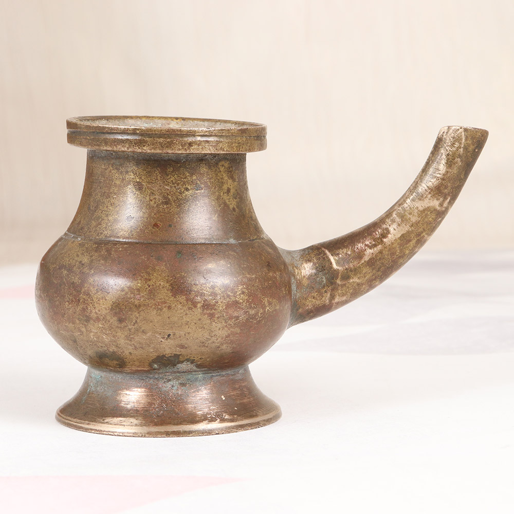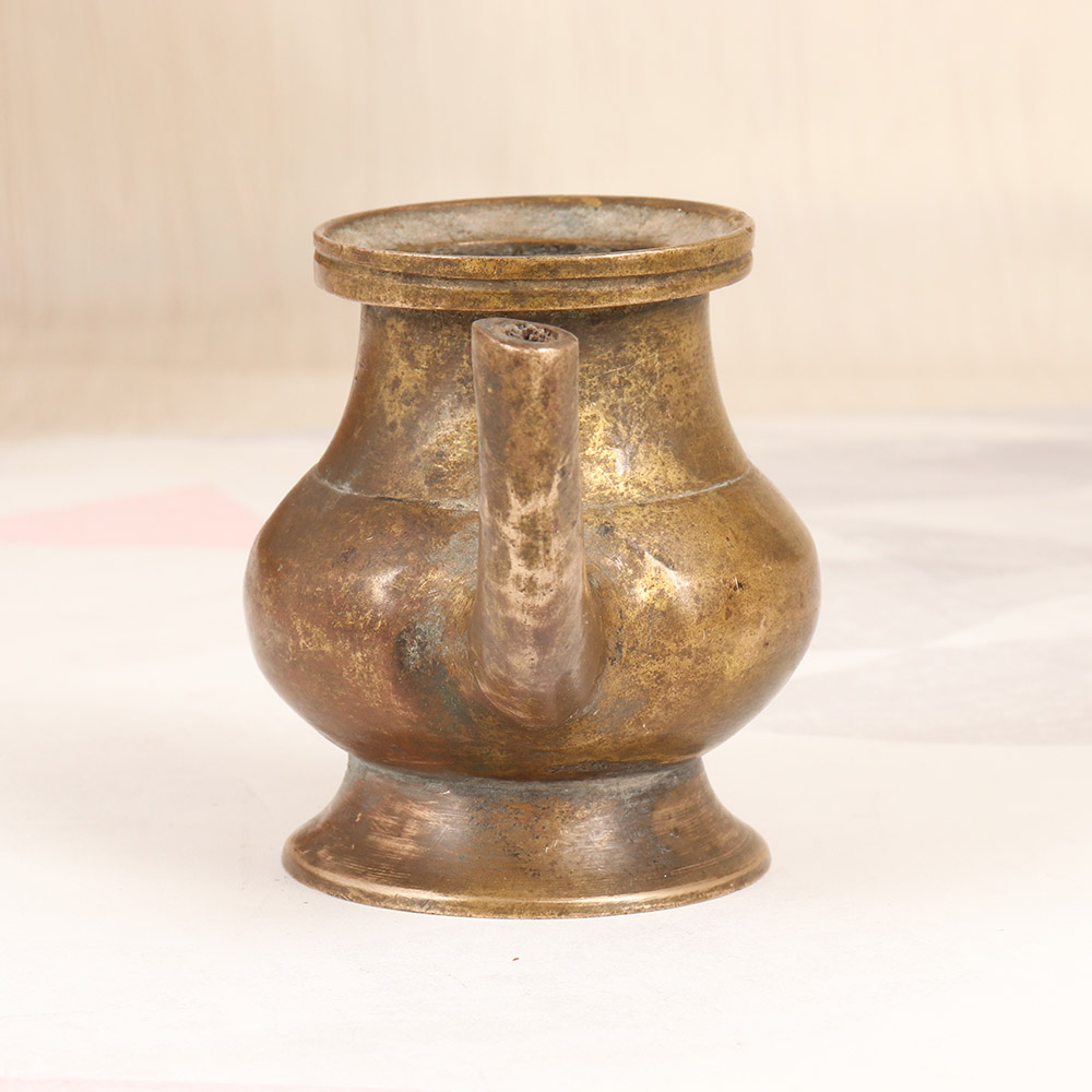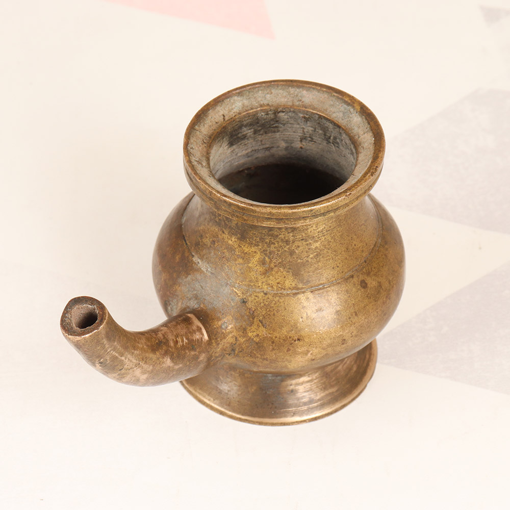 Immerse yourself in the timeless beauty of South Indian art with this exquisite vintage brass holy water pot. Crafted with meticulous attention to detail, this captivating piece brings a sense of reverence and cultural significance to any sacred space. This holy water pot is more than just a functional accessory - it's a vessel that connects you to a rich cultural heritage. The plain brown finish exudes a sense of simplicity and timelessness, allowing the brass's natural beauty to take center stage. Whether you're performing daily rituals or seeking a centerpiece for your meditation area, this pot will elevate your practice with its significance and visual appeal. Embrace the power of tradition and invite the divine into your home with this stunning brass holy water pot. Its connection to South Indian art and culture makes it a truly special piece that will be cherished for generations. Transform your spiritual routine into a moment of profound connection and reflection with this remarkable accessory.