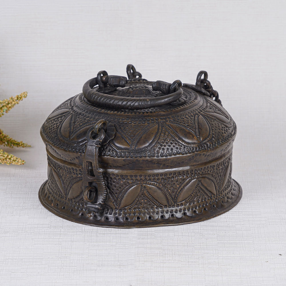 Buy a brass jewelry box online that is made by skilled Indian artisans with their hands. This luxurious piece showcases breath-taking engraved designs and features a captivating dark brown finish, making it a truly eye-catching addition to any space. The jewelry box is not only a practical storage solution for your precious gems and jewelry but also doubles as a stunning decorative item for your home or office. Designed with convenience in mind, this jewelry box is equipped with a sturdy handle on the top, allowing for easy transport and handling. Its antique finish adds a touch of elegance and sophistication to any room. The secure latch ensures the safety of your valuable possessions. This exceptional piece is not only ideal for personal use but also serves as a marvellous display item at museums or exhibitions, captivating the attention of customers with its intricate craftsmanship. An extraordinary gift for your loved ones on special or festive occasions, expressing your thoughtfulness and appreciation. Experience the allure of our brown luxury jewelry box, combining style, functionality, and timeless beauty in one remarkable creation.