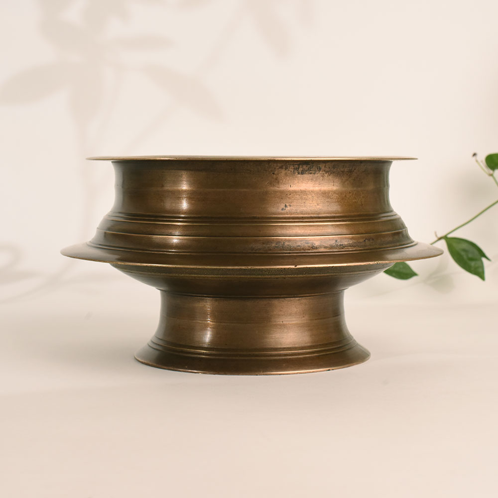 Introduce a timeless accent to your home with this classic wide brass pot. The soft, earthy tone and understated design make it a versatile piece for displaying flowers, storing water for rituals, or simply adding a touch of heritage to your space. Crafted by hand from durable brass, the pot features subtle grooves around the body, adding visual interest without overwhelming simplicity. Use it as a planter for leafy green plants, as a decorative container for festival offerings, or as a stand alone statement on a mantel. The piece will develop a natural patina with age, adding to its rustic charm. Each pot is unique, reflecting the artisanal skills used in its creation.