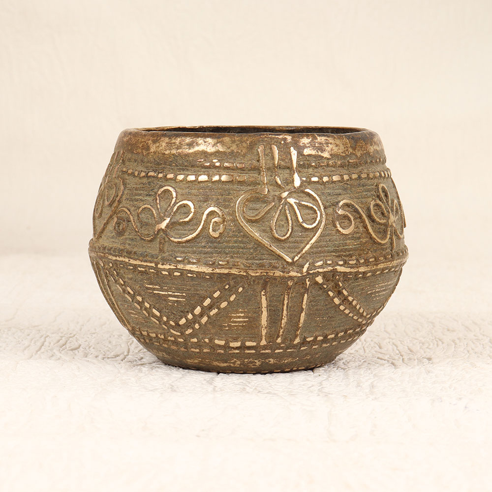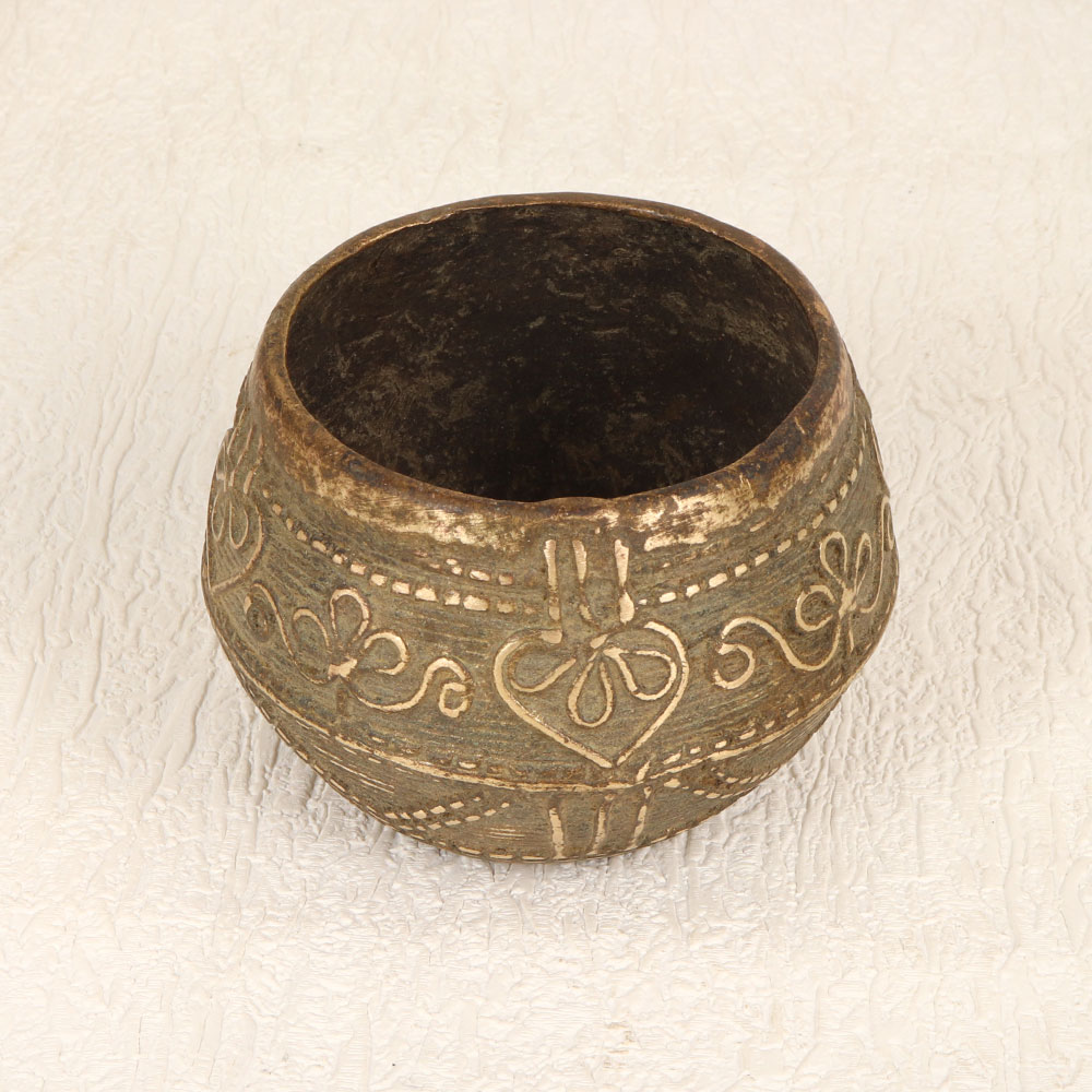 A Vintage Brass Rice Measurement Bowl which is a timeless piece meticulously crafted by skilled Indian artisans from the culturally rich region of Odisha. This unique bowl not only showcases the craftsmanship of these artisans but also embodies the rich heritage of India. Made from high-quality brass, the bowl features intricate engravings that tell a story of tradition and artistry. The antique brown finish adds a touch of elegance, giving it a distinguished and nostalgic appearance. Handmade with precision, this vintage bowl serves as a captivating decorative item suitable for various settings ÃĢ€“ be it at home, in the office, a restaurant, hotel, or cafe. Its versatile design allows it to seamlessly blend into any environment, enhancing the aesthetic appeal of the space. However, due to its vintage nature, we recommend using this bowl exclusively for decoration purposes. It makes for a remarkable addition to any vintage collection, showcasing a piece of history in a contemporary setting. Moreover, this meticulously crafted brass bowl is an ideal and thoughtful gift for your family, friends or relatives on special, festive, or auspicious occasions, creating a connection between the past and the present. Elevate your surroundings with this exceptional Vintage Brass Rice Measurement Bowl, a tribute to the artistry and cultural legacy of Odisha's skilled artisans.