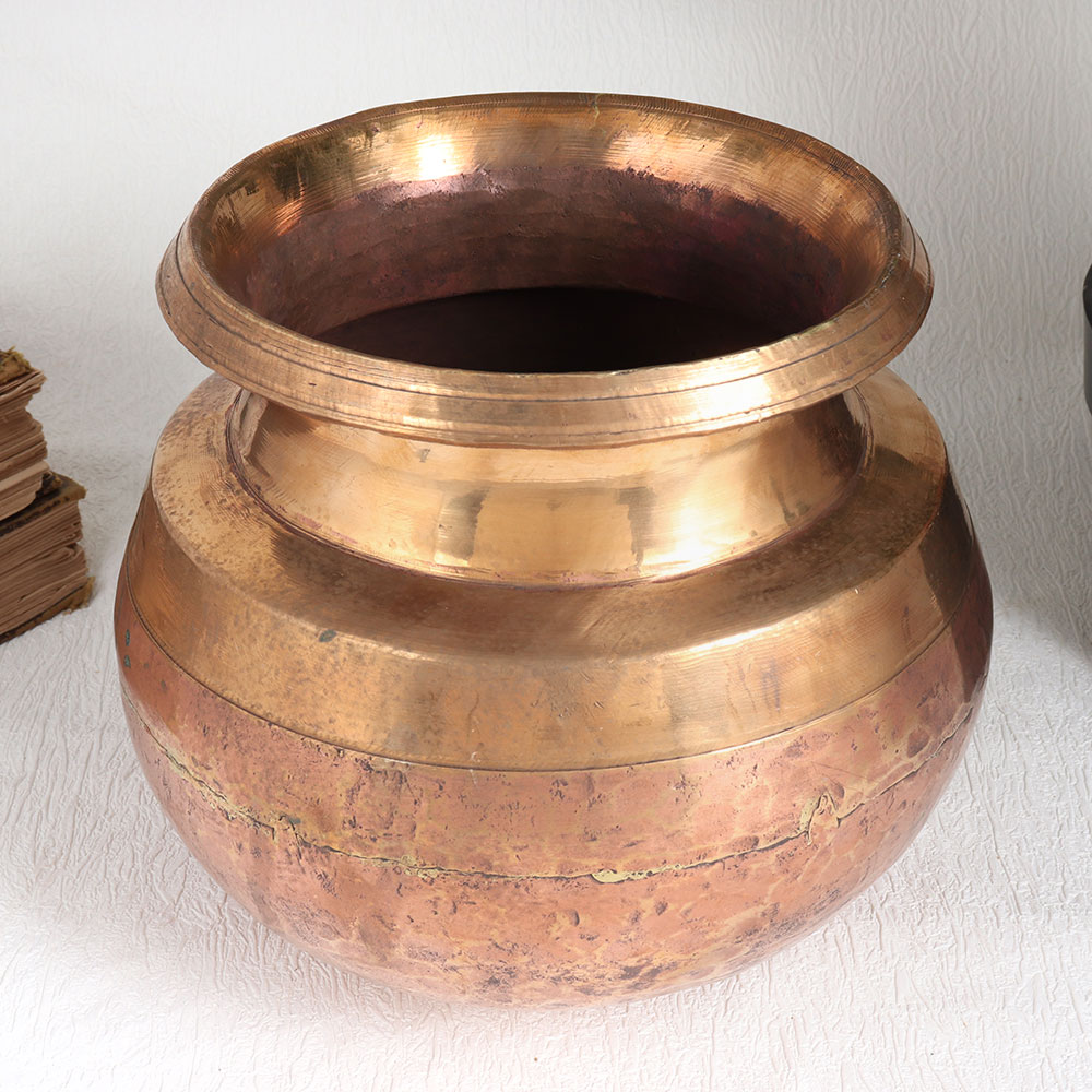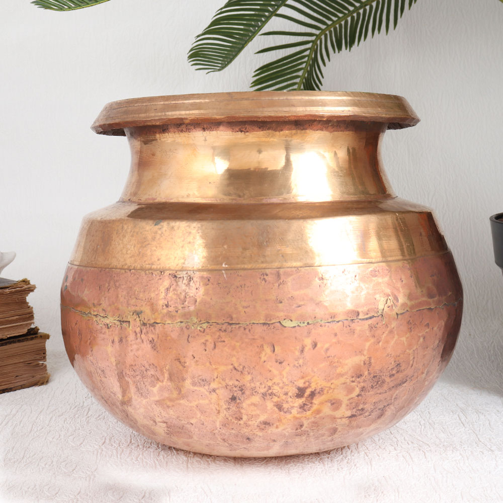 Buy a Vintage Copper Cooking Pot online that is a true masterpiece crafted by skilled Indian artisans. This stunning piece boasts a lustrous antique golden finish, showcasing the timeless beauty of high-quality copper. Handmade with precision and care, this pot reflects the rich craftsmanship of Indian artisans. Its versatile design allows it to adorn various settings, whether it's your home, office, restaurant, hotel, cafe, or shop. You can use it as an elegant decorative item or repurpose it as a charming flower pot. As a vintage treasure, we recommend using it primarily for decoration to preserve its unique charm. This pot serves as a remarkable addition to your vintage collection or can be proudly displayed at exhibitions, captivating onlookers with its aesthetic appeal and historical significance. Consider gifting this Vintage Copper Cooking Pot to your family, friends or relatives on special, festive, or auspicious occasions. It's not just a gift, it's a piece of art that carries the heritage and craftsmanship of India, sure to be cherished for generations to come. Enhance your surroundings and share the beauty of tradition with this exceptional masterpiece.