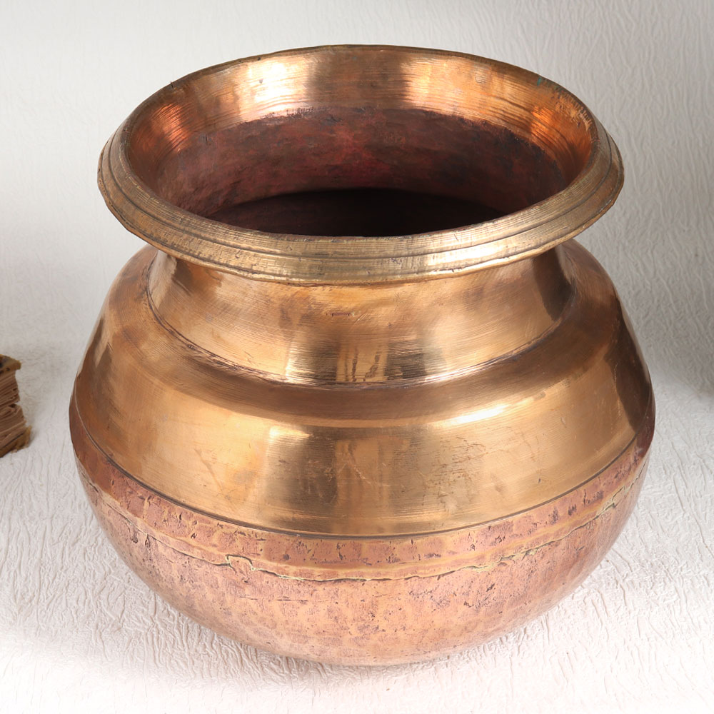 This Exquisite Vintage Copper Cooking Pot is a true testament to craftsmanship and elegance. Handmade by highly talented Indian artisans with meticulous attention to detail, this cooking pot boasts a stunning antique golden finish that adds a touch of opulence to any space. Crafted from high-quality copper, this pot exudes a timeless charm that transcends generations. While it may no longer serve its original culinary purpose, it finds new life as a versatile decorative piece. Whether at home, the office, a restaurant, hotel, cafe, or shop, it enhances any setting with its vintage allure. This vintage copper pot is a collector's dream, perfect for those who appreciate the artistry of a bygone era. It's an ideal addition to your vintage collection or a striking exhibit piece at events and exhibitions. As a thoughtful gesture, consider gifting this copper pot to your family, friends or relatives on special, festive, or auspicious occasions. It's not just a gift, it's a piece of history and artistry that will be cherished for years to come. Embrace the beauty of the past with this remarkable Vintage Copper Cooking Pot.