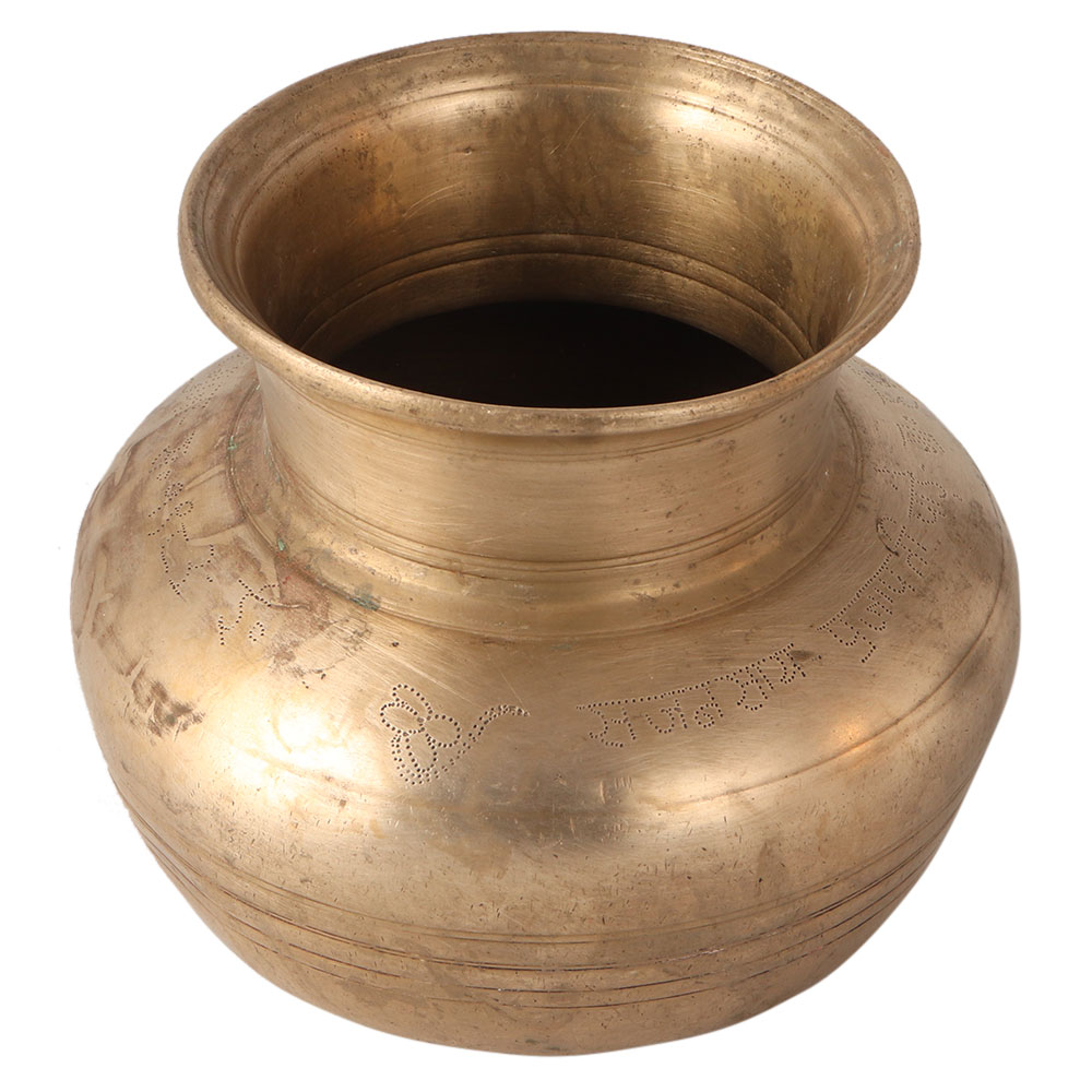 Vintage style Indian Kalash is made of white metal alloy is made of white metal alloy. It has a line pattern on the sides. A Kalash is a vessel that has a narrow opening with a large belly to hold sacred water, rice, gold coins, flowers or gems. Placing the Kalash in the north or east of a room with sacred water will increase positive energy in your home.