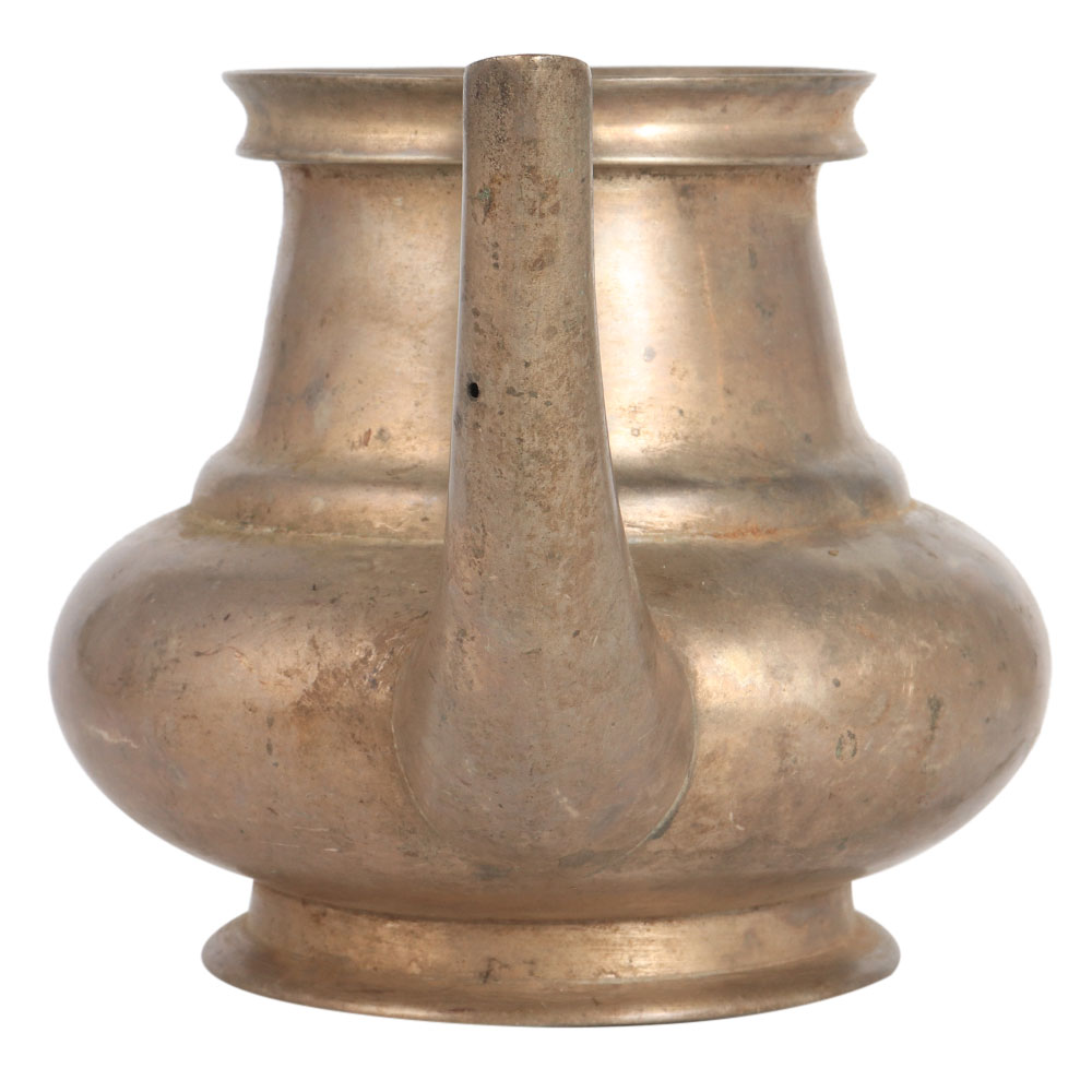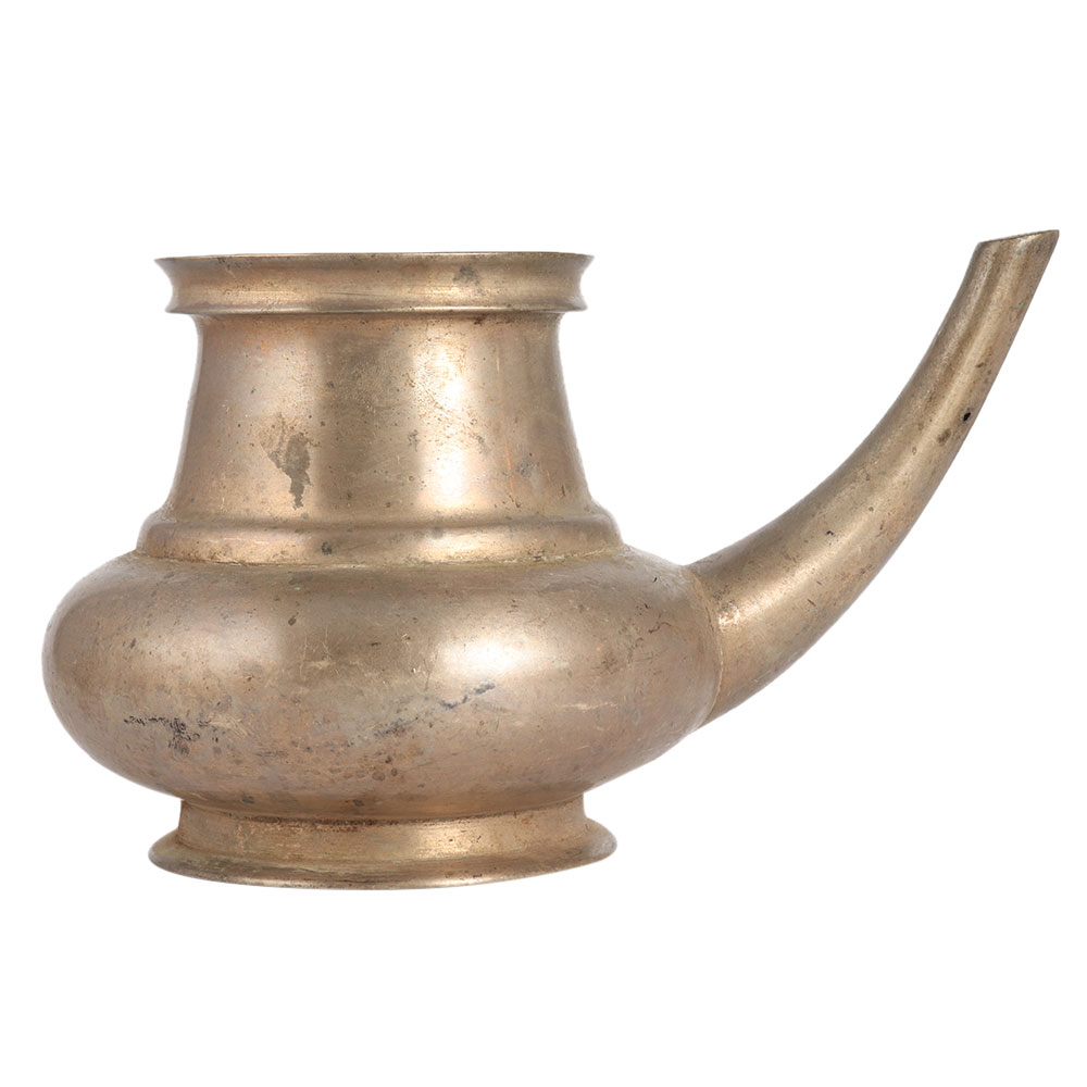 This vintage holy water pot is carved from brass metal alloy. It was hand carved by skilled Indian craftsmen in South Indian art. It has a long spout for pouring holy water at spiritual places. Priests in Hindu temples use this pot to offer blessings to the devotees. It is used to hold holy water during various Hindu rituals. Often used in Hindu havans or other rituals. Place it as a flower pot on a table or shelf in your home, restaurant, spa or hotel. It will be an eye-catcher in your vintage collection.