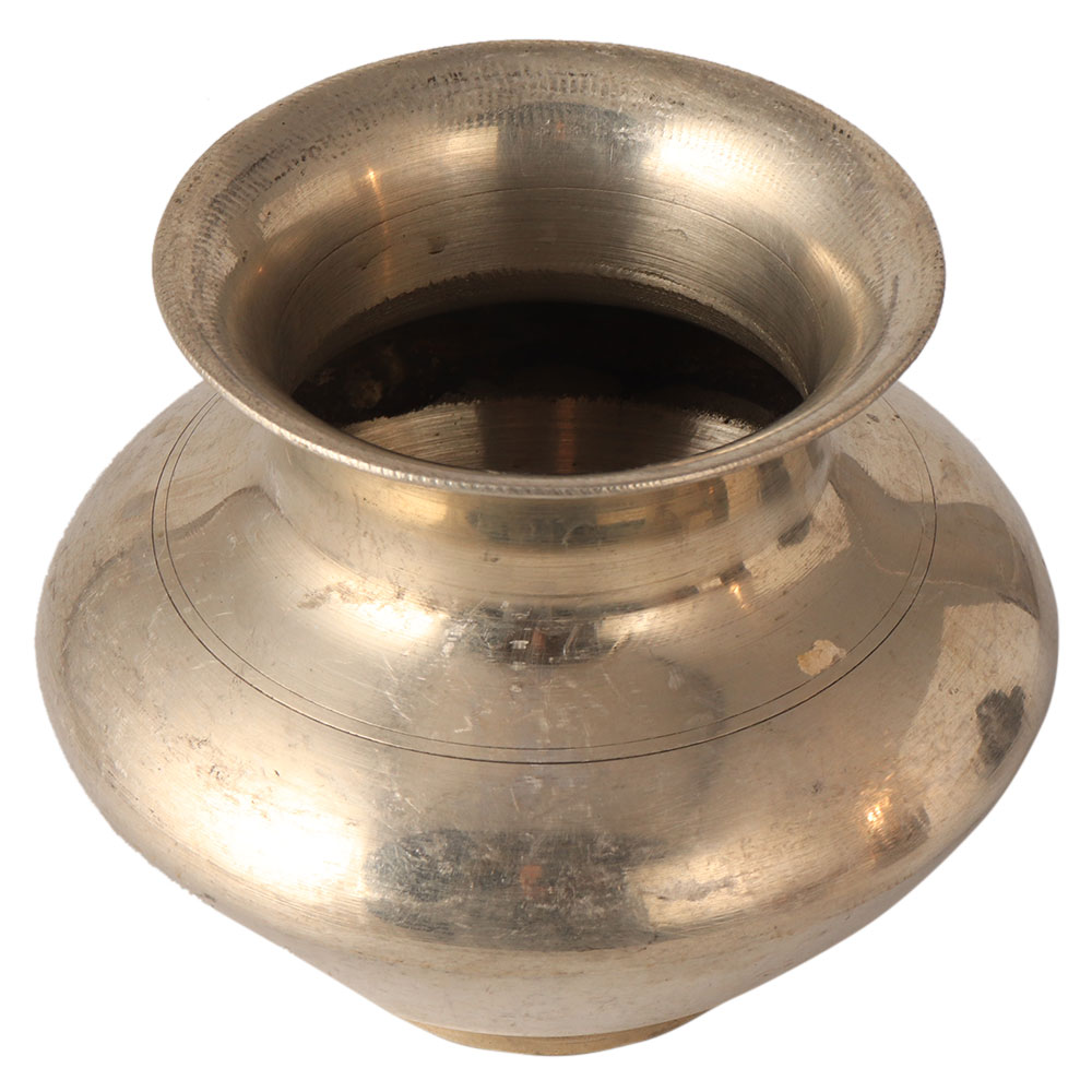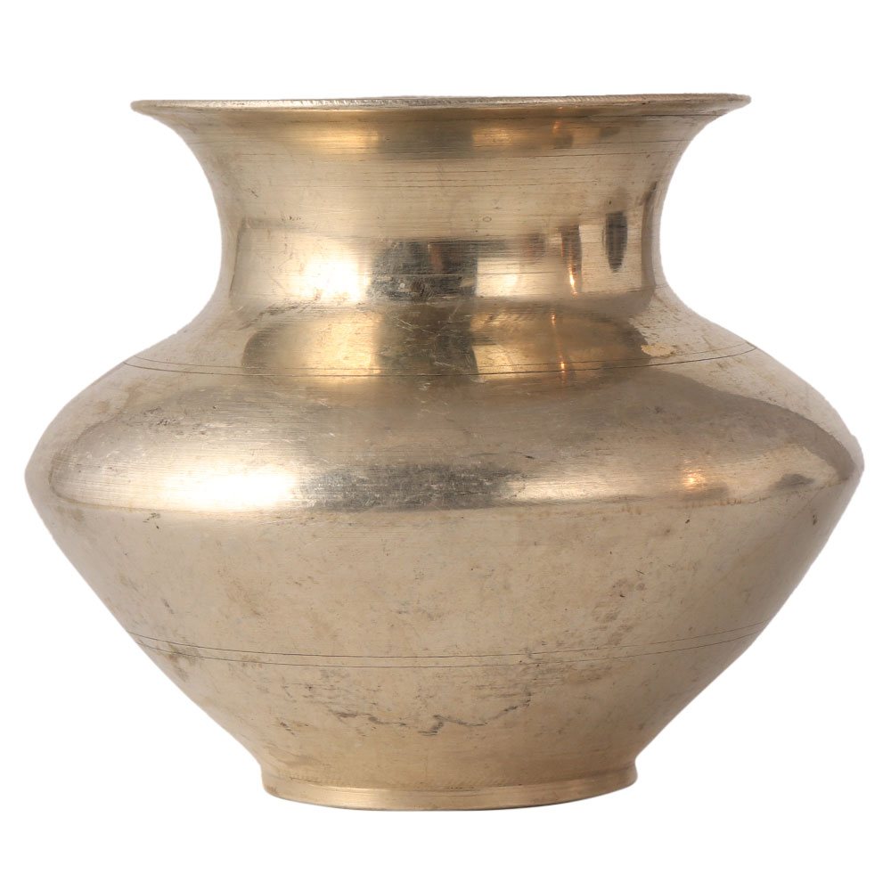 This shiny vintage holy water pot is traditionally handcrafted in Himachal Pradesh, India. This holy water pot is used in religious ceremonies to hold holy water, rice, gems, gold coins, etc.
