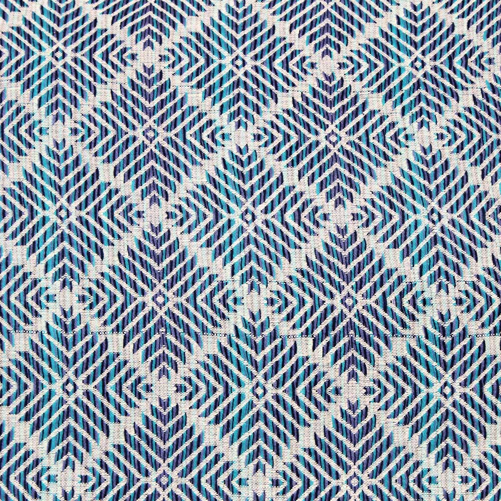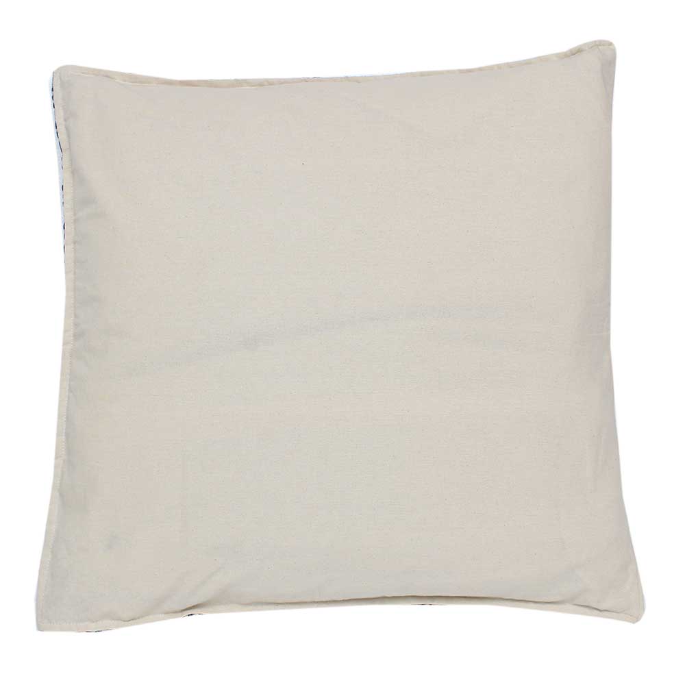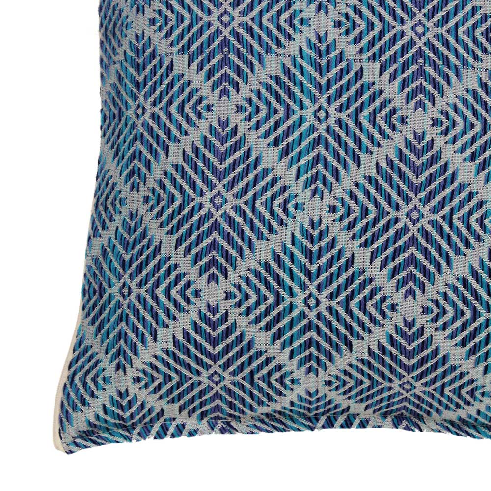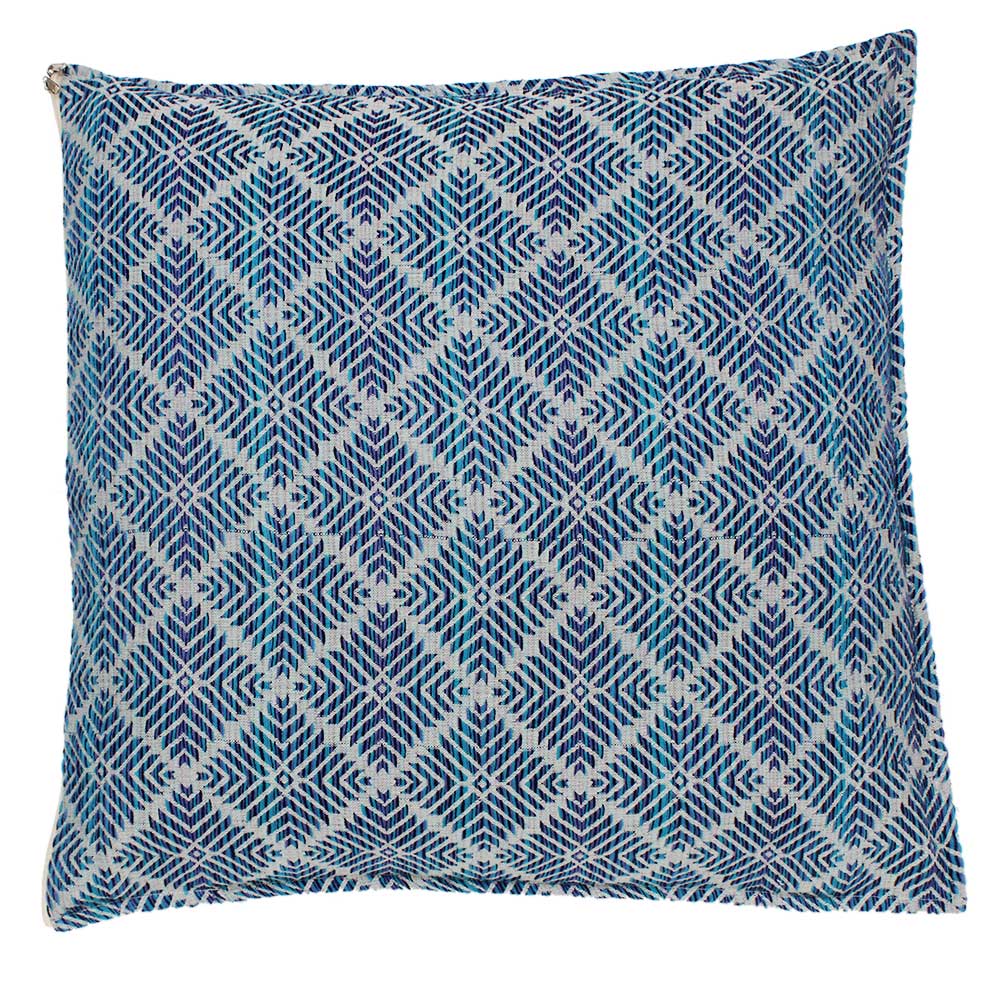 Hand-embroidered geometric shapes in dark and light blues with deep red stitching, perfect for any house or office.