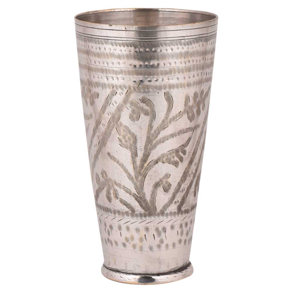 Intricately carved brass lassi glass With leafy pattern decorated with circular dotted rings on the top with a lovely shape. It is made by the local craftsmen of India. Use it as a flower vase, table decoration, pen and pencil holder and place on the study table , holds spoons and knives and placed on the dining table. Also a great corporate gift.
