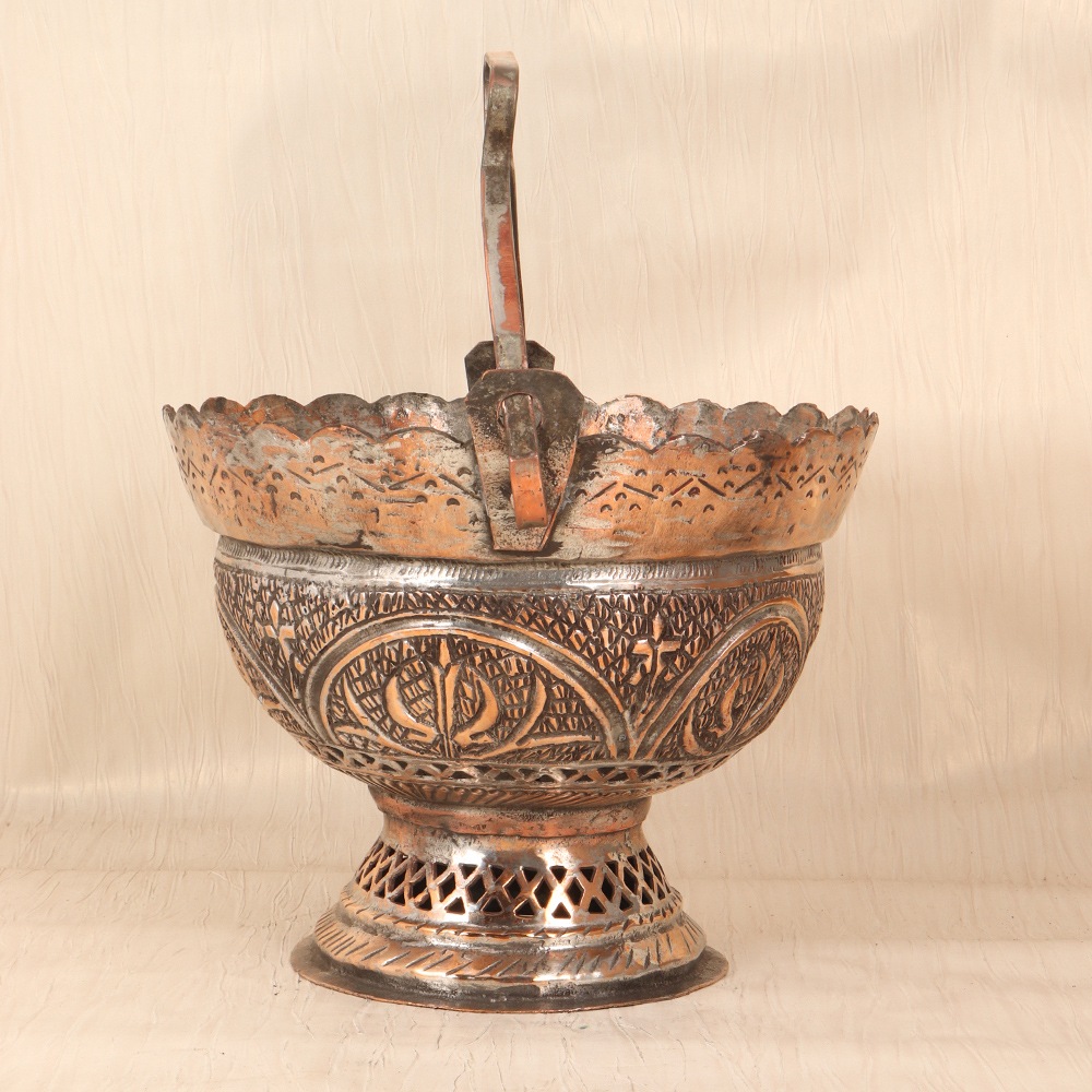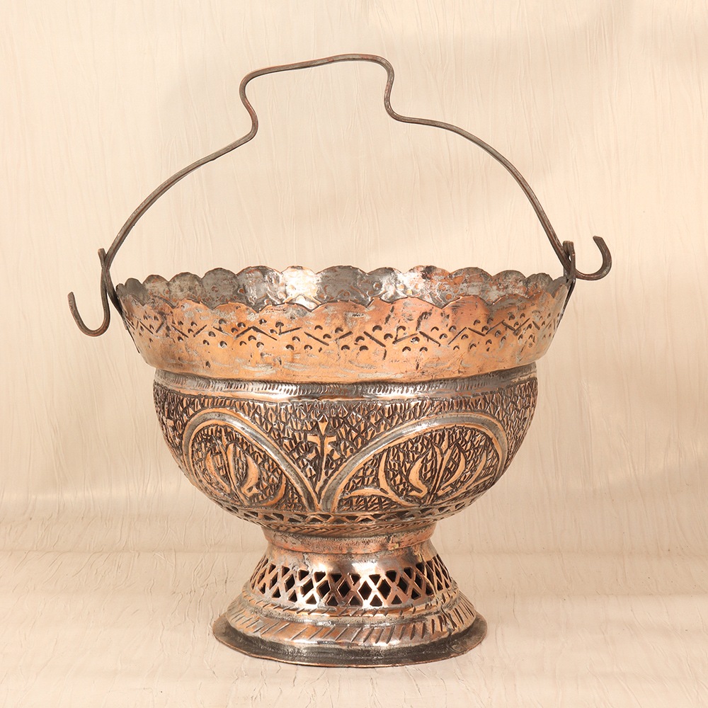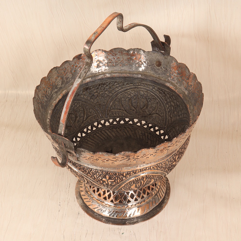Immerse yourself in the captivating world of Islamic art with this exquisite vintage copper bucket. Crafted with meticulous attention to detail, this piece is a masterful blend of function and aesthetic, destined to captivate and inspire. More than just a decorative piece, this vintage copper bucket is a testament to the rich cultural heritage that has influenced artisans for centuries. Imagine the warm, inviting glow of the copper, casting a soft light that enhances the mesmerizing patterns that adorn its surface. Whether you're a collector of Islamic art, a lover of unique home decor, or simply seeking to infuse your space with a touch of cultural elegance, this copper bucket is the perfect addition. Display it proudly on a mantel, side table, or bookshelf, and let it become a captivating focal point that sparks conversations and inspires awe. Embrace the allure of Islamic artistry and elevate your home with this stunning vintage copper bucket. It's a piece that will not only captivate your guests but also serve as a constant reminder of the timeless beauty and craftsmanship that has defined the Middle East for generations.