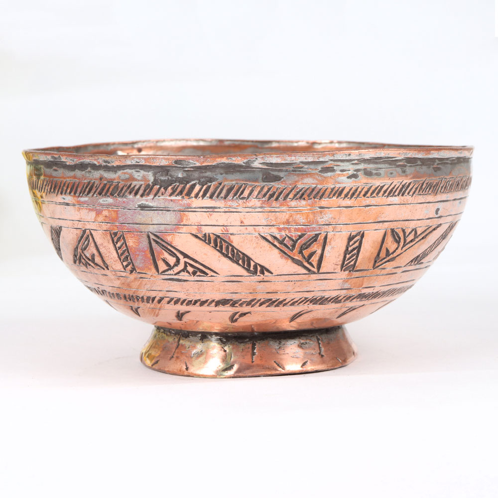 Decorate your living room with the timeless allure of our vintage Copper Bowl that is a masterpiece crafted by talented artisans in Islamic Art. This exquisite bowl boasts an enchanting antique brown finish, showcasing the rich patina that only time can bestow. Intricately engraved with meticulous detail, each stroke reflects the artistry of its creators, creating a stunning visual tapestry that tells a story of tradition and craftsmanship. Handmade from high-quality copper, this bowl transcends mere décor, it's a testament to the enduring beauty of artisanal skill. Versatile in its application, the bowl seamlessly integrates into various settings, be it at home, office, restaurant, hotel, or cafe. Use it as a captivating decorative piece or repurpose it as an indoor flower pot, infusing nature with the grace of vintage aesthetics. An ideal addition to any vintage collection, this copper bowl is more than an object; it's a statement of refined taste and appreciation for heritage. Consider it a thoughtful gift for your family, friends or relatives on special, festive, or auspicious occasions, a gesture that encapsulates the warmth of tradition and the enduring charm of handmade artistry.