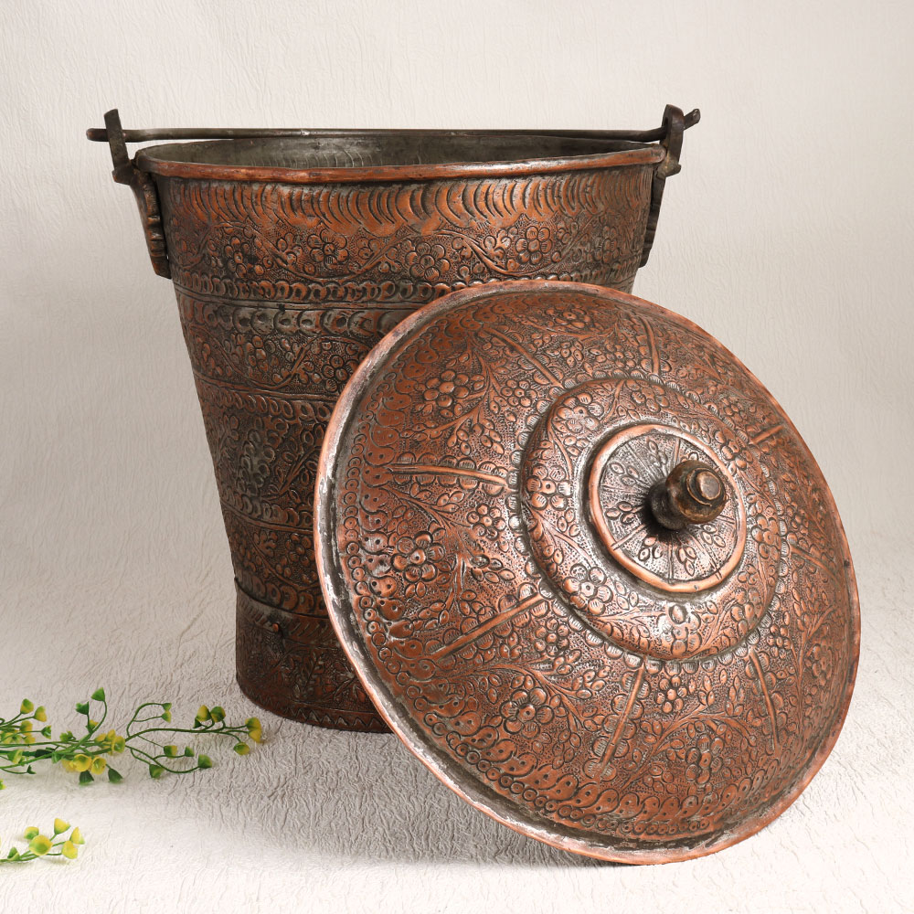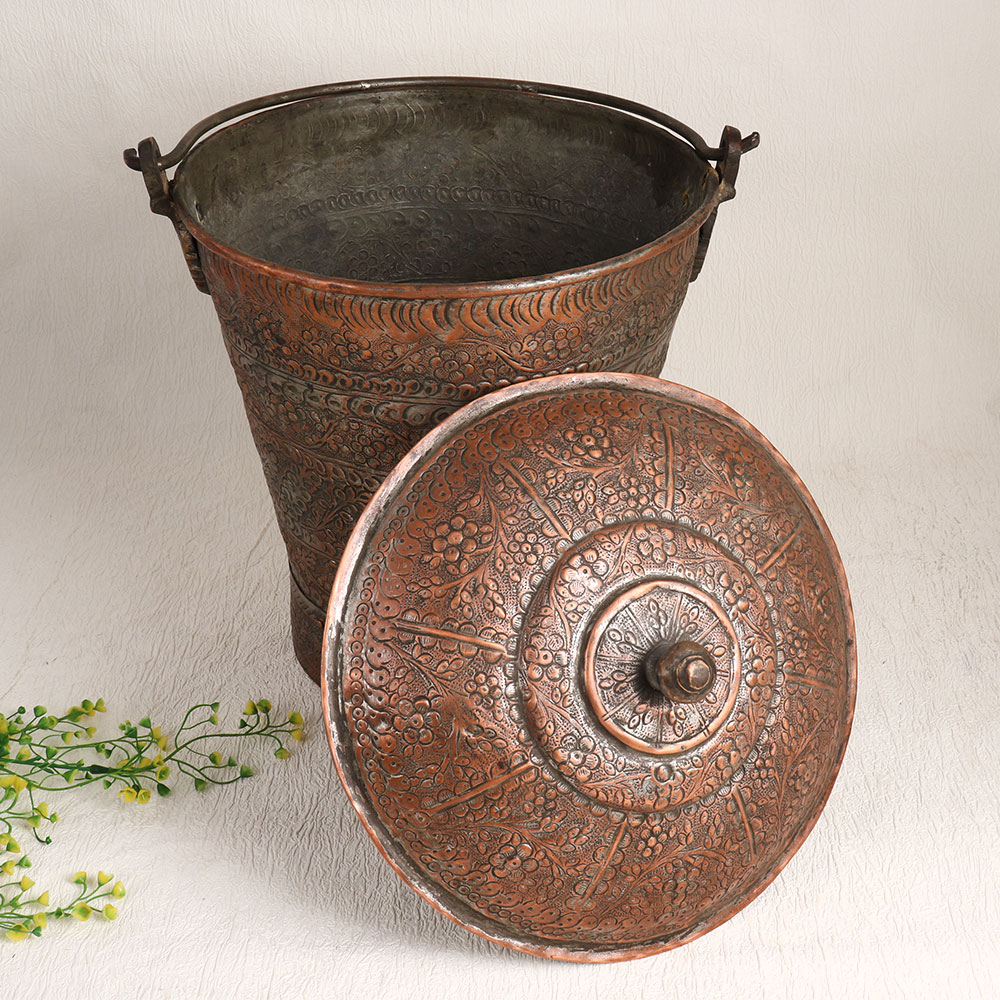 Enhance your interior decor with the timeless charm of our Vintage Copper Bucket with Engraving. This exquisite piece is crafted by highly skilled artisans in the tradition of Islamic Art and boasts exceptional craftsmanship. Made from high-quality copper, it showcases an antique brown finish that lends it an authentic vintage appeal. With its enchanting engravings and ornate lid, this copper bucket is a testament to the intricate artistry of its makers. Its sturdy handle adds to its functionality, making it a versatile piece that can adorn various settings. While it can be a stunning addition to your home, office, restaurant, hotel, cafe, or shop, we recommend using it primarily for decorative purposes due to its vintage nature. This piece is perfect as a flower pot, adding an air of sophistication to your floral arrangements. Furthermore, this vintage copper bucket is an excellent addition to your vintage collection or as an eye-catching display at exhibitions. It's also a thoughtful gift for your family, friends or relatives on special, festive, or auspicious occasions, symbolizing tradition, artistry, and elegance. Embrace the past and infuse your space with the beauty of this vintage masterpiece.