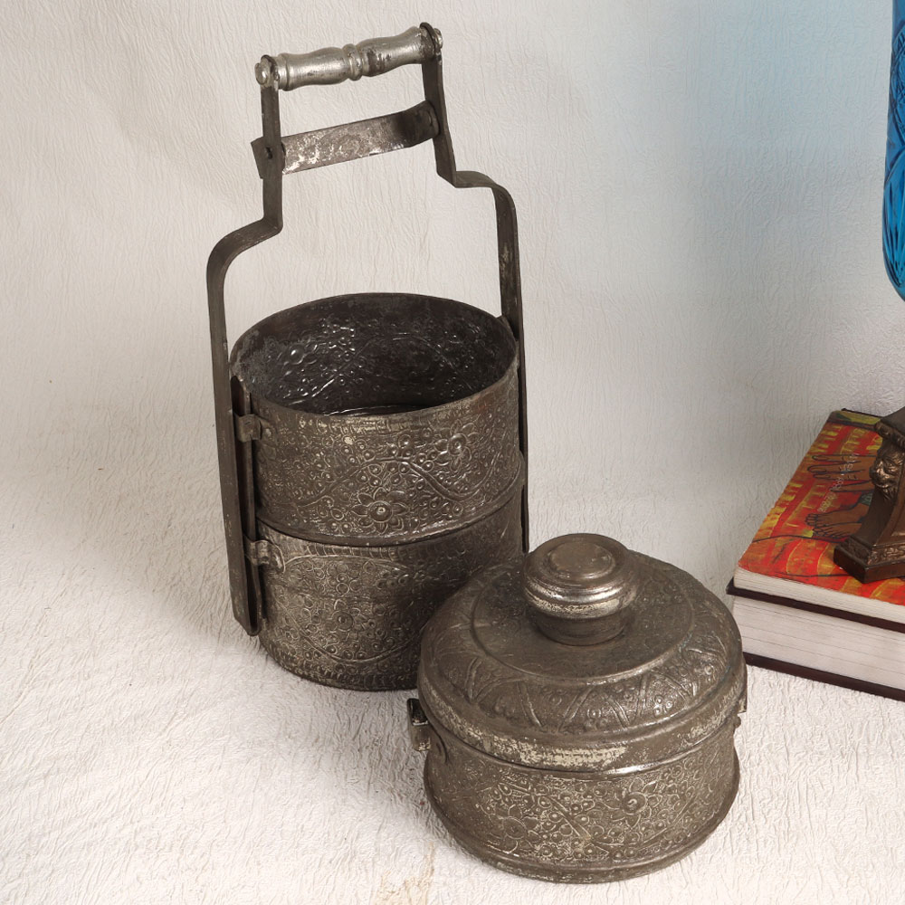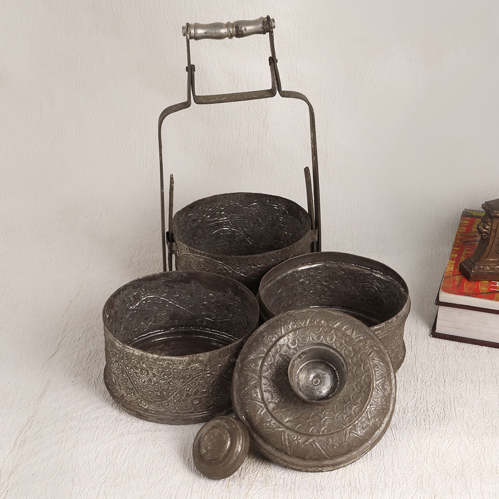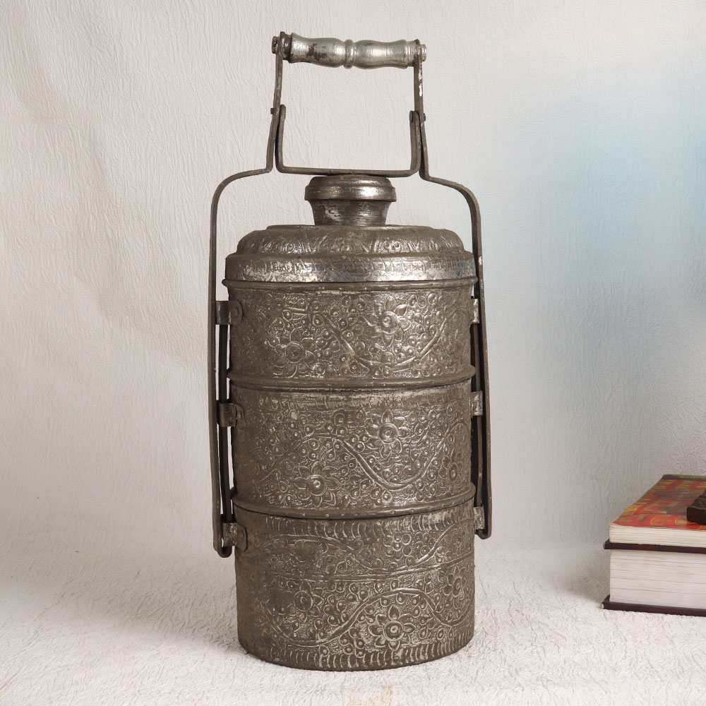 Our Vintage Tiffin Box with three compartments complete with an elegant handle and exquisite hand-carved details, all showcased in a stunning antique gray finish. This extraordinary piece is handcrafted by talented Indian artisans who have harnessed the timeless beauty of Islamic Art to create this treasure. Made from high-quality copper, this Tiffin box is not just a functional item but a work of art that brings a touch of vintage charm to any space. While its original purpose was to carry food, this vintage gem is best suited for decoration today. Place it in your home, office, restaurant, hotel, cafe, or shop to infuse a touch of nostalgia and elegance into your surroundings. Whether you're an avid collector of vintage items or seeking a unique gift, this Vintage Tiffin Box is a splendid choice. Give it to your family, friends or relatives on special occasions, festive celebrations, or auspicious moments, and let them cherish the exquisite craftsmanship and rich heritage it represents. It's more than a mere decoration, it's a symbol of artistry and tradition.