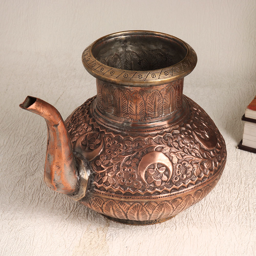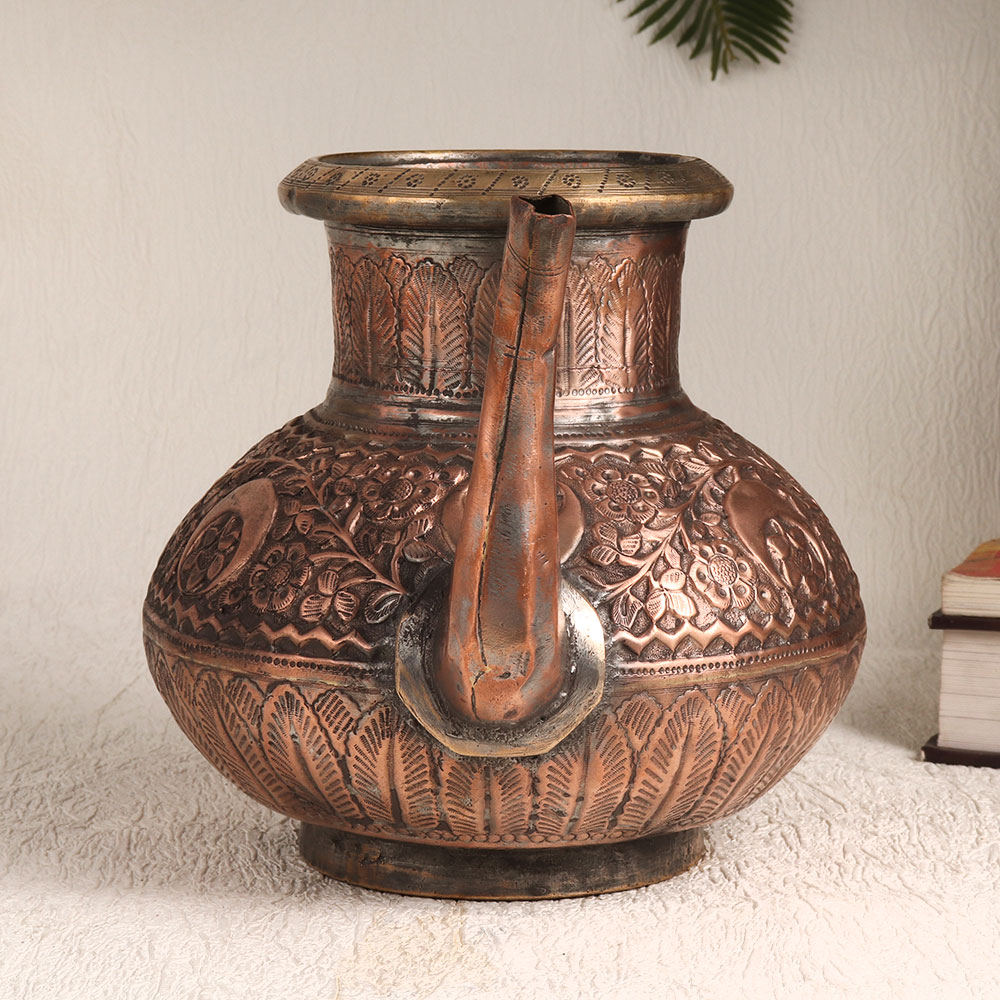 Enhance your interior decor with the timeless charm of this vintage copper water pot. Skillfully handcrafted by artisans in the heart of Hyderabad, this piece is a testament to the rich heritage of Islamic art. The pot boasts an antique brown finish that exudes an aura of age-old elegance, evoking memories of a bygone era. This exceptional water pot is a masterpiece in high-quality copper which is meticulously carved with intricate designs that pay homage to the region's cultural and artistic legacy. Its ornate spout adds a touch of sophistication, making it not just a functional piece, but a work of art. Perfect for a variety of settings, including homes, offices, restaurants, hotels, cafes, and shops, this pot is a versatile decoration. Its practicality shines during havans, rituals, and auspicious occasions, adding a touch of tradition to your ceremonies. For collectors of vintage treasures, this copper water pot is a must-have addition to your ensemble. And for those looking for a thoughtful gift, it's a symbol of love and best wishes, suitable for special, festive, or auspicious occasions. Embrace the beauty of history with this remarkable copper masterpiece.