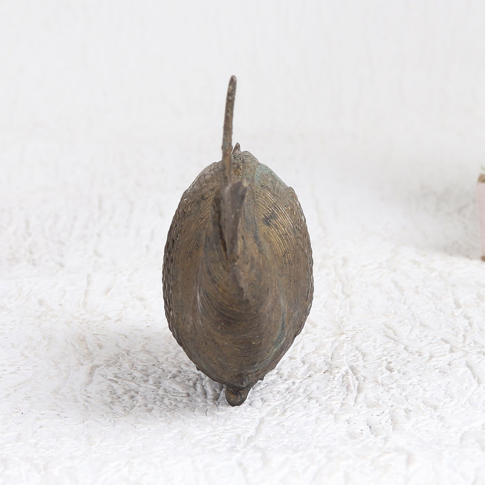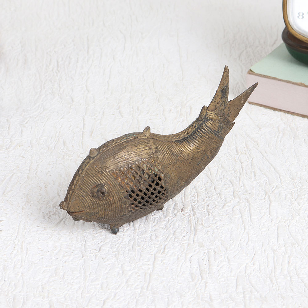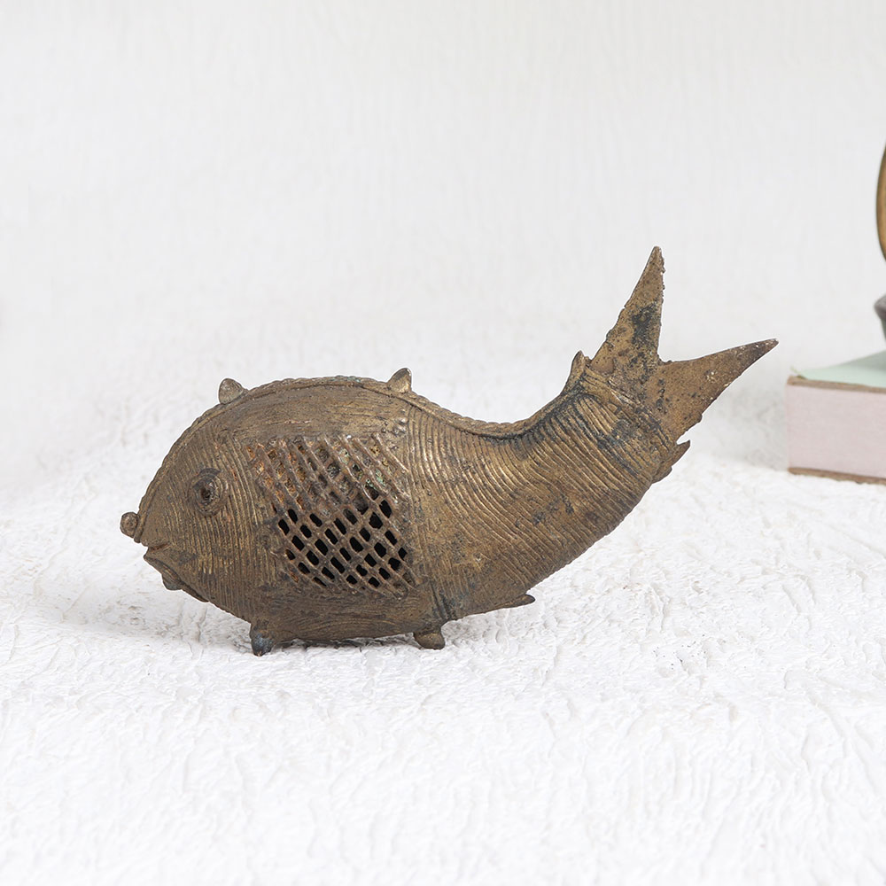 Enhance your interior with the timeless elegance of our exquisite brass fish statue that is adorned with intricate jali work and finished in a rich antique brown patina. Crafted by the deft hands of talented Indian artisans, this masterpiece is a testament to their artistry and dedication to preserving ancient craftsmanship traditions. The brass statue exudes an aura of antiquity, making it a versatile addition to various settings. Whether it's gracing the elegance of your home, the professionalism of your office, the ambiance of a restaurant, hotel, cafe, or the charm of a boutique shop, this fish statue is a statement piece that can seamlessly complement any environment. As a collector's item, it adds depth to your vintage collection and as an exhibition piece, it can captivate admirers with its intricate detailing. Furthermore, this splendid creation makes for a thoughtful and cherished gift for your family, friends or relatives on special, festive, or auspicious occasions. Embrace the timeless allure of this brass fish statue, a symbol of artistry, tradition, and enduring beauty.