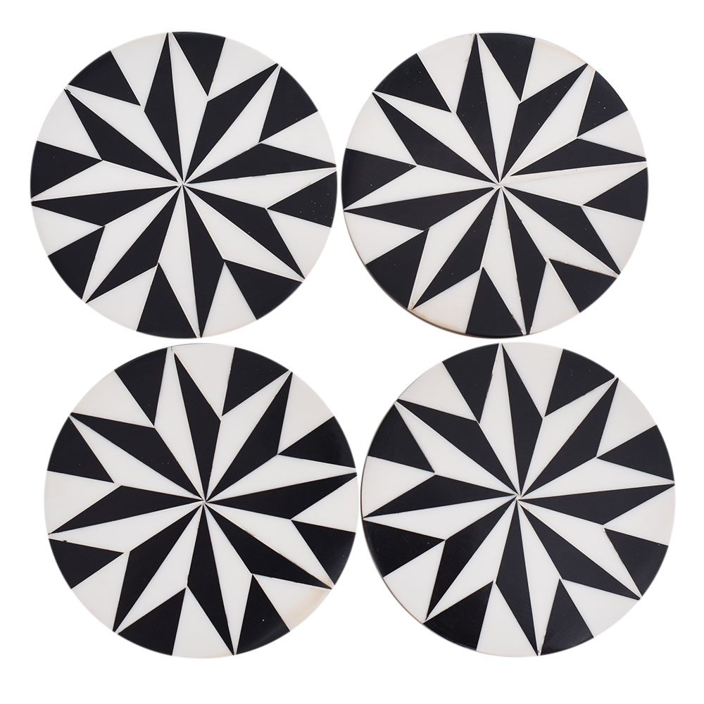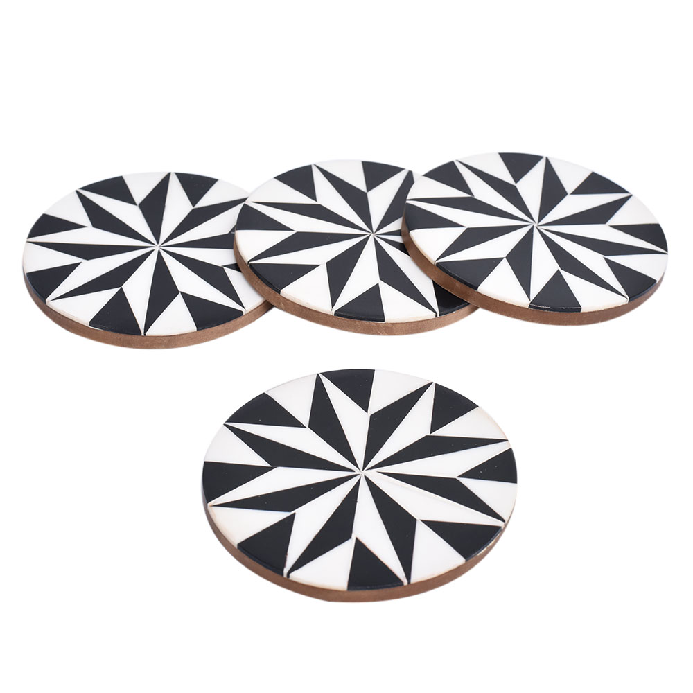 The beautiful black and white Kaleidoscope coasters were handcrafted, creating a fun geometric pattern that is eye-catching, making these great party essentials. It comes as a complete set of four coasters. While you sip your beverage, these coasters will keep your furniture dry. Most glasses and mugs can be placed on these because of their generous size. Because they are made of resin and wood, these coasters are ideal for preventing spills and water rings.