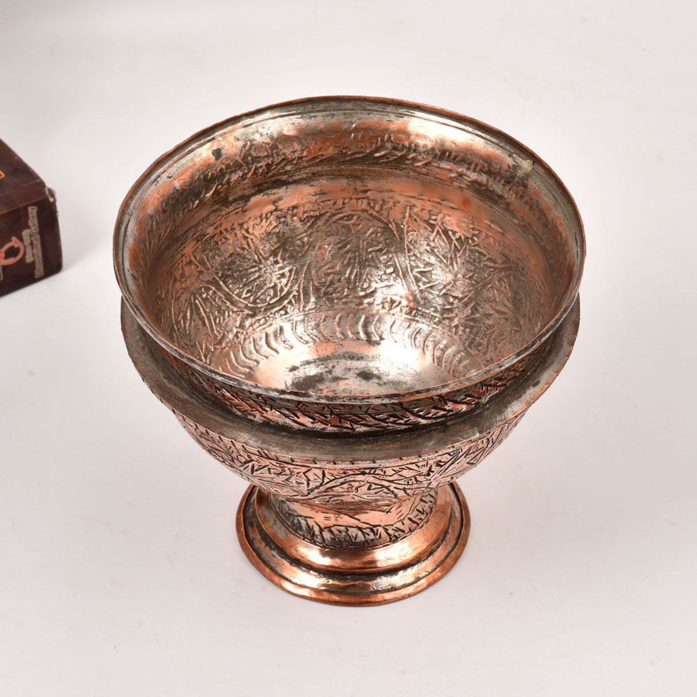 Elevate your home decor with the timeless elegance of this vintage copper bowl, adorned with the captivating artistry of Kashmiri Islamic-inspired engraving. Crafted with meticulous attention to detail, this stunning piece is a true testament to the rich cultural heritage of the region. The mesmerizing engraved patterns on this copper bowl are a feast for the eyes, drawing the viewer in with their intricate, swirling designs. Imagine placing this captivating piece on your coffee table or kitchen counter, where it will instantly become the focal point of the room, evoking the rich history and artistry of Kashmir. Beyond its aesthetic appeal, this vintage copper bowl is also incredibly practical. Copper is naturally antimicrobial, making it an ideal choice for food preparation or serving. The included stand ensures the bowl is displayed at the perfect height, allowing you to showcase your prized possession with pride. Whether you use it to hold fresh fruit, display decorative items, or simply admire its beauty, this copper bowl will become a cherished addition to your home.