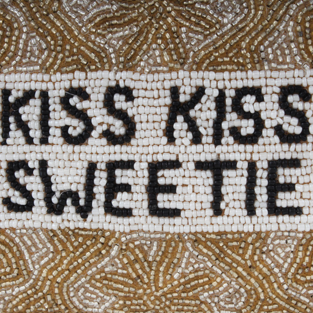 A stunning vintage white glass seed beaded evening bag or clutch. The entire purse is hand beaded in small white glass seed beads with a lovely KISS KISS SWEETIE motif.