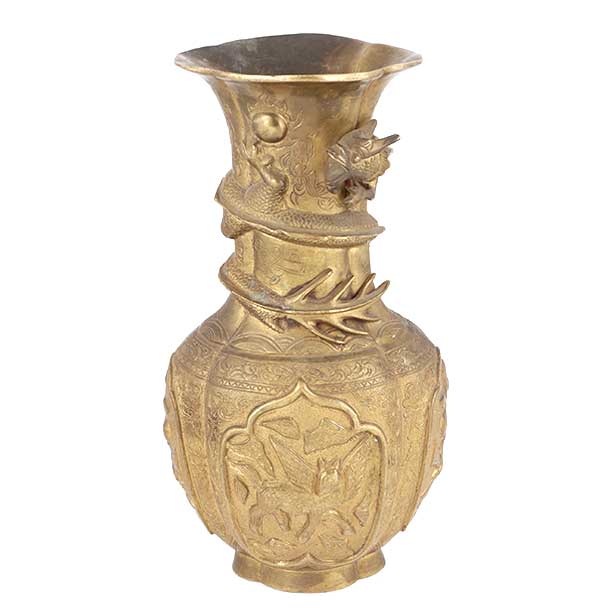 This is a Very Gorgeous Chinese Brass Dragon Vase. The Body of the Vase are Ornately Decorated with Two Dragons Chasing the Flaming Pearl of Knowledge. The Third Dragon Appears on the Neck of the Vase.