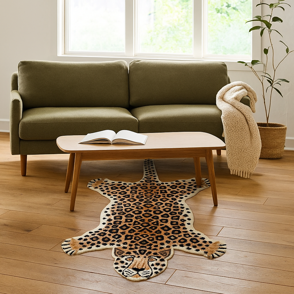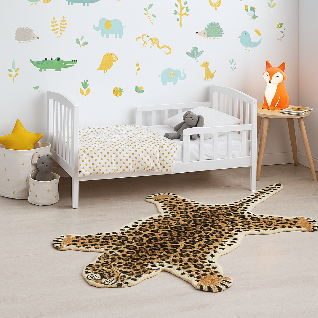 A realistic looking little cheetah lying flat on its back in your space sounds like something your visitors will remember. You can't go wrong with this purchase. The snout is flawless, the paws are of realistic proportions, and the hide is unmistakably cheetah. Take note of how the spine runs the length of its back, all the way down to the straightened tail. This Leopard rug is hand-tufted from dyed woolen yarn. Created and developed in a small workshop; skilled artisans ensure the highest quality. Each detail, stripe, and dot is added with extreme care. Add a charming animal rug to your living space.