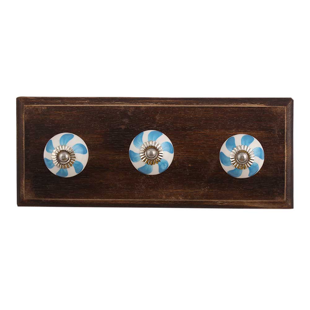 Light Blue Fan Ceramic Wooden Hook. A Perfect Complement to the Soft Tone of the Wood are these White Traditional Hat & Coat Hook Made of Genuine Porcelain and Brass. It can be use to Hang Jewellery, Leashes, Towels, Scarves, Light Weight Sweaters, Caps Etc.