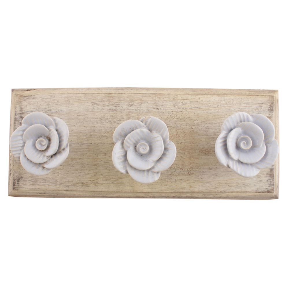 Light Blue Medium Rose Flower Ceramic Wooden Hooks. A Perfect Complement to the Soft Tone of the Wood are these White Traditional Hat and Coat Hook Made of Genuine Porcelain and Brass. It can be used to Hang Jewelry, Leashes, Towels, Scarves, Light Weight Sweaters, Caps etc.
