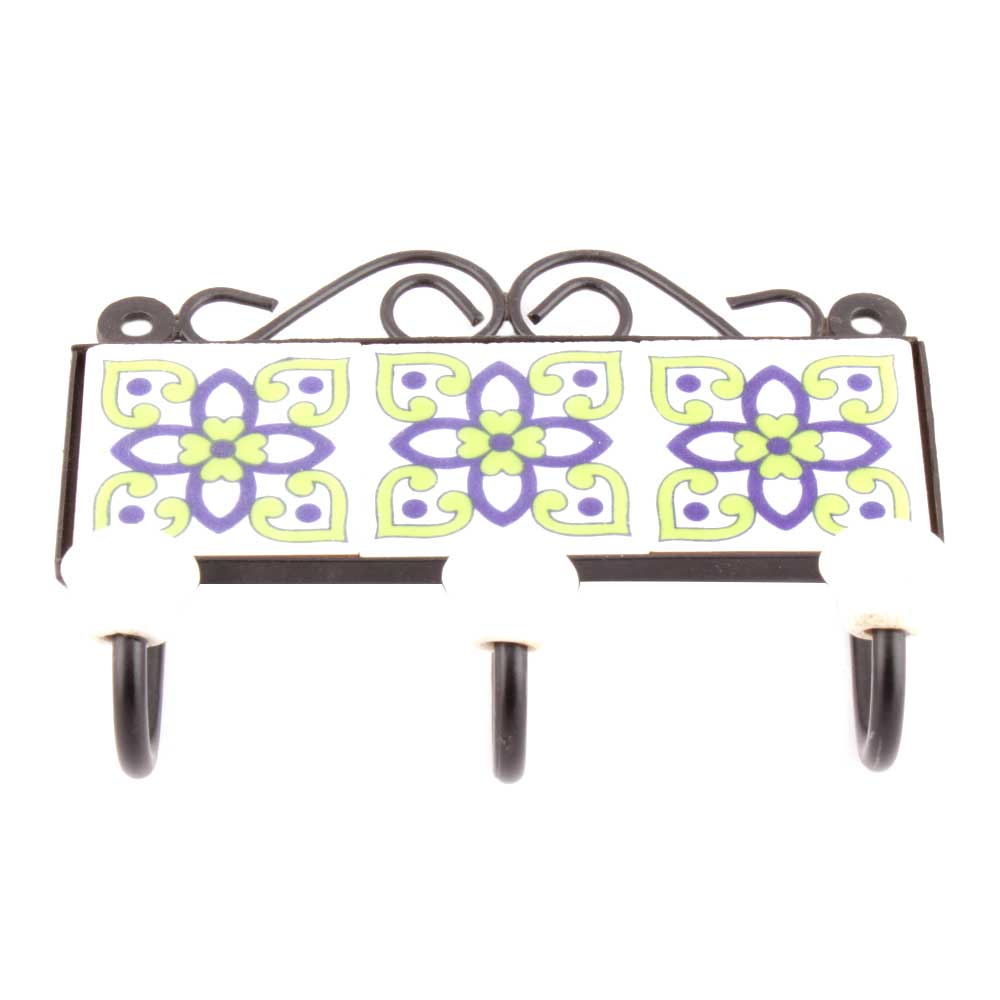 Light Green And Navy Blue Floral Tiles Hook.When Put on Wall or Cabinet it is an Art in itself. The Metal Part of this Hook is Black Powder Coated.