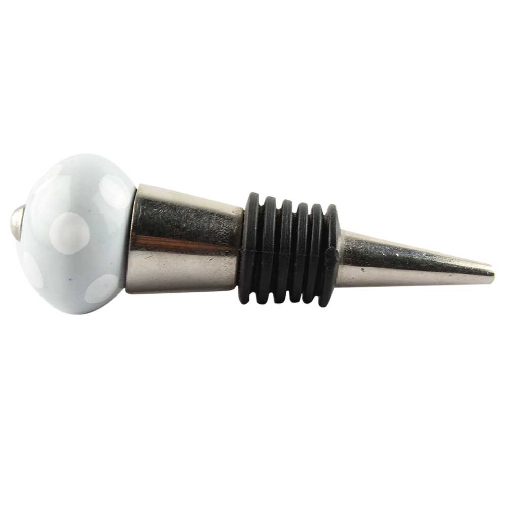 Light Grey Dotted Small Ceramic Wine Stopper. Zinc Alloy Wine Bottle Stopper with Attractive Jute Bag Packaging.