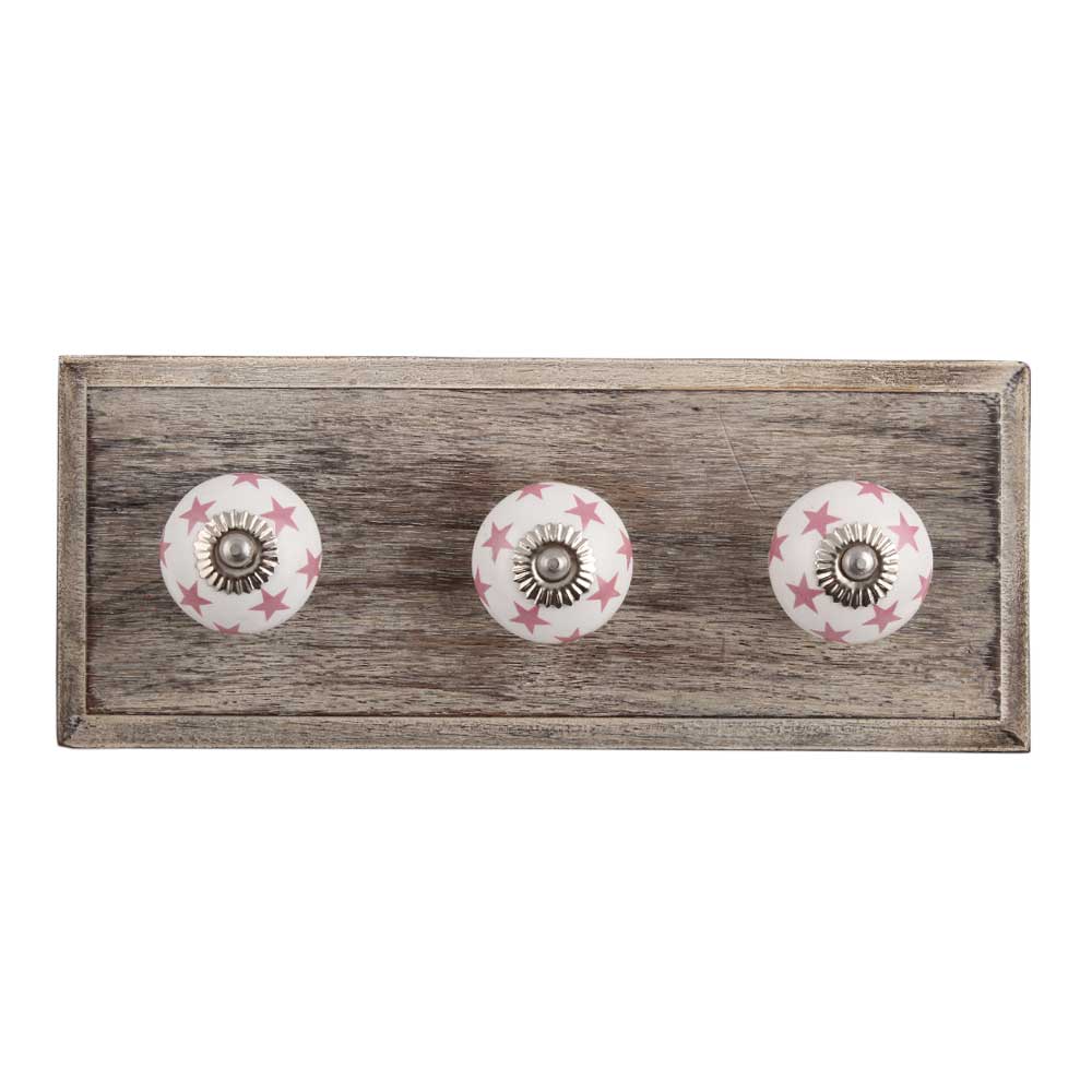 Light Pink Star Ceramic Wooden Hook. A Perfect Complement to the Soft Tone of the Wood are these White Traditional Hat & Coat Hook Made of Genuine Porcelain and Brass. It can be use to Hang Jewellery, Leashes, Towels, Scarves, Light Weight Sweaters, Caps Etc.