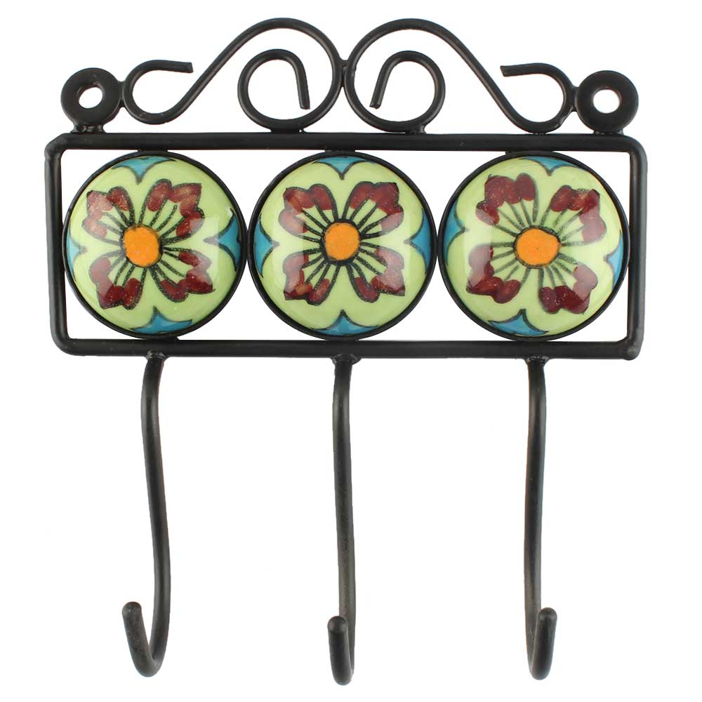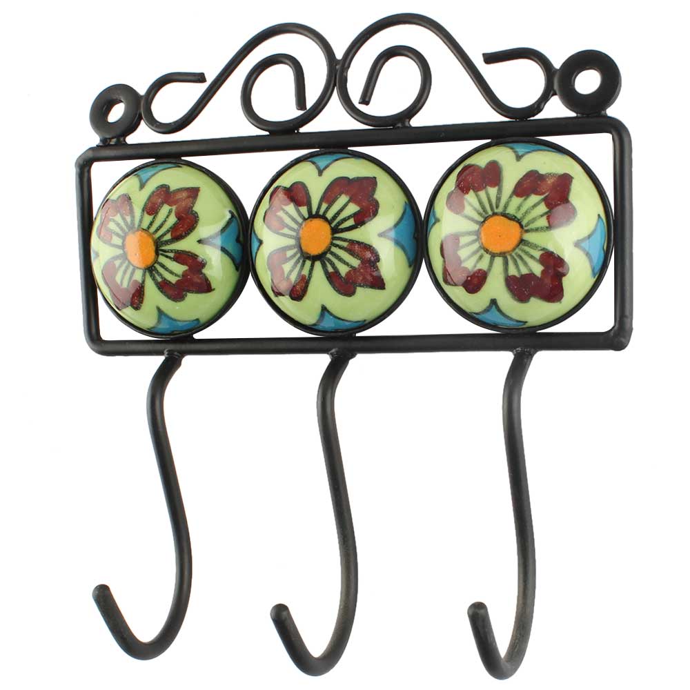Lime Green Floral Ceramic Tile Hook Online. When Put on Wall or Cabinet It is An Art in Itself. The Metal Part of this Hook is Black Powder Coated.