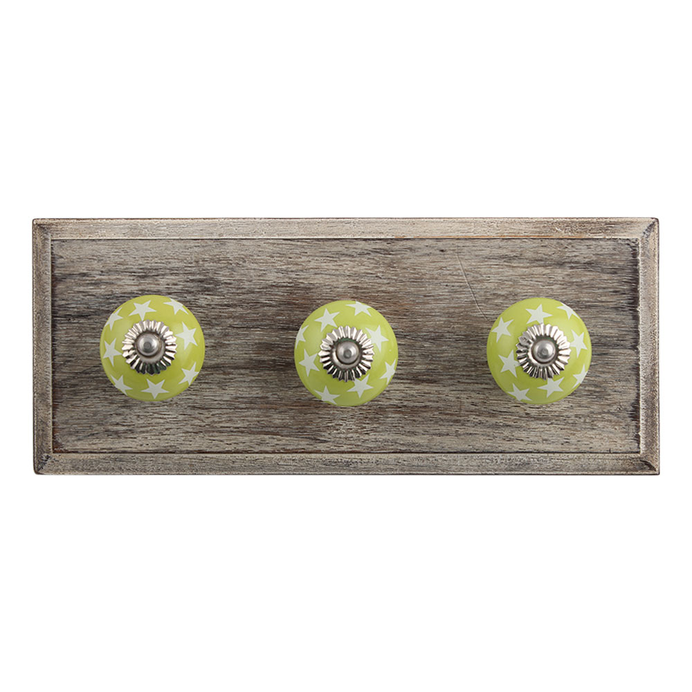 Lime Green Star Ceramic Wooden Hook. A Perfect Complement to the Soft Tone of the Wood are these White Traditional Hat & Coat Hook Made of Genuine Porcelain and Brass. It can be use to Hang Jewellery, Leashes, Towels, Scarves, Light Weight Sweaters, Caps Etc.