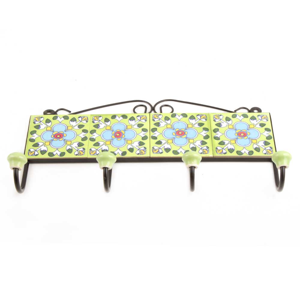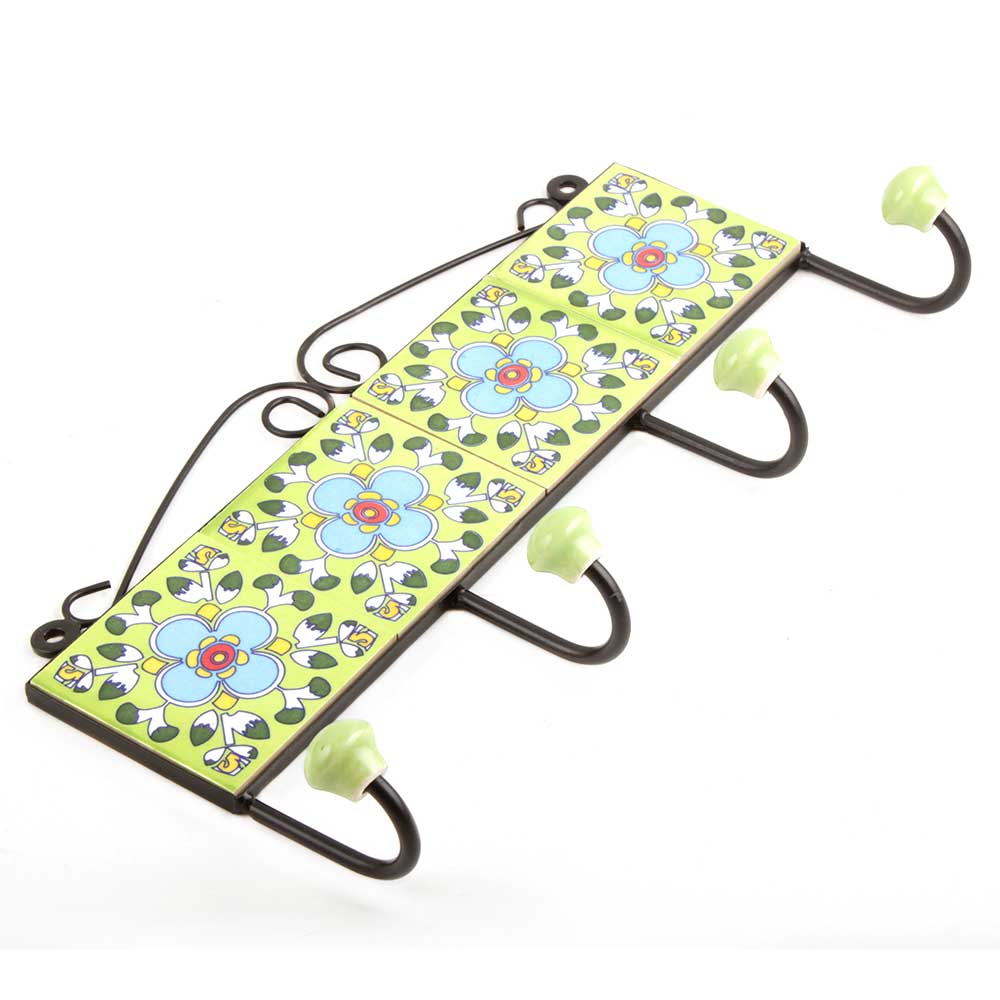 Lime Green Turquoise Flower Tiles Hooks .When put on wall or cabinet it is an art in itself. The metal part of this hook is black powder coated.