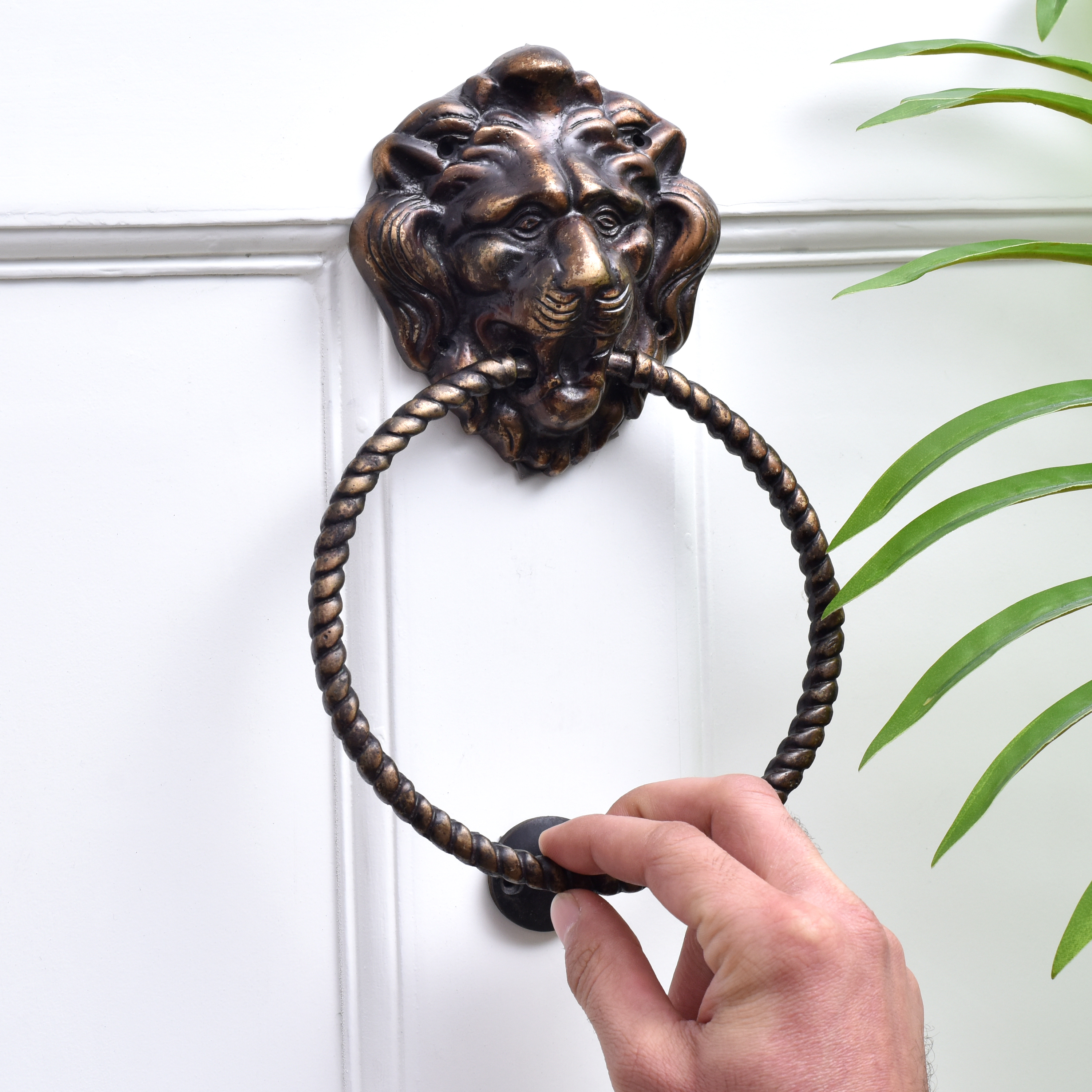 The ornate craftsmanship on this Lion Face Cross Ring Brass Door Knocker makes it look to be straight out of the mediaeval era. This knocker is made of high-quality brass and can be used as a decorative piece on your front door or gate.