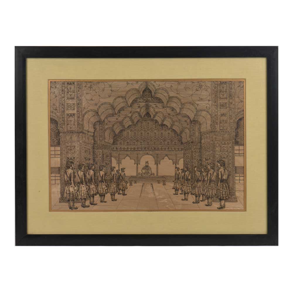 A court scene with the Last Mughal Emperor, Bahadur Shah II seated on a chair with lion claw feet, on a terrace. The sketch shows the Central figure of Bahadur Shah seated on a throne within the interior of a beautiful palace, surrounded by his sons and various court officials. The sketch shows the day to day activities in the court of bahadur shah and his courtiers.