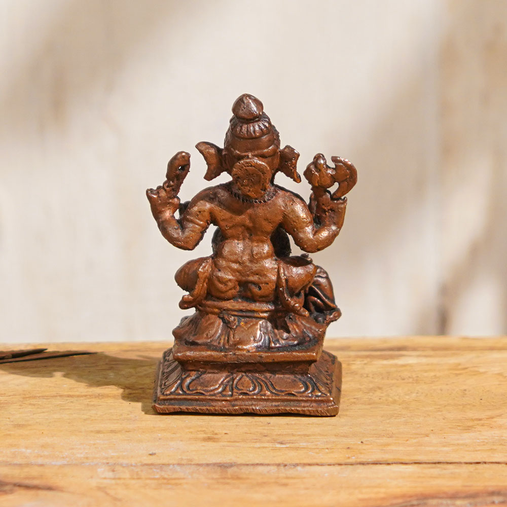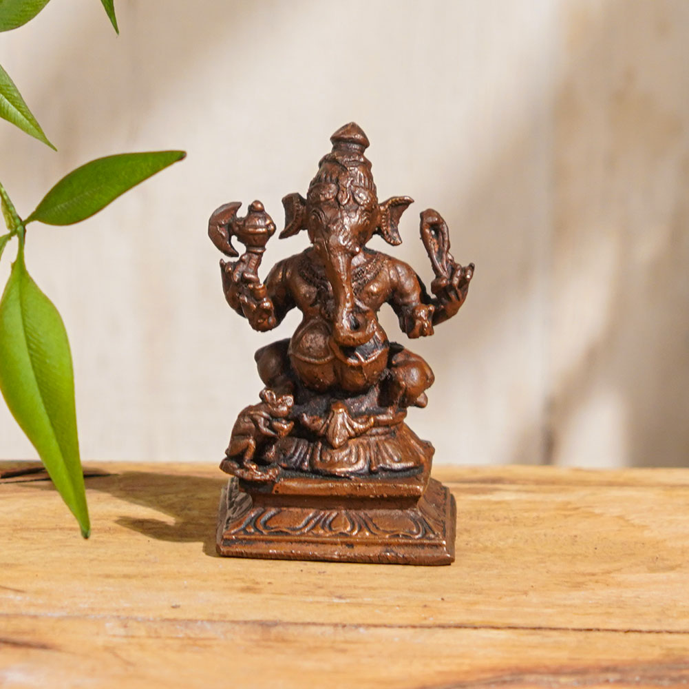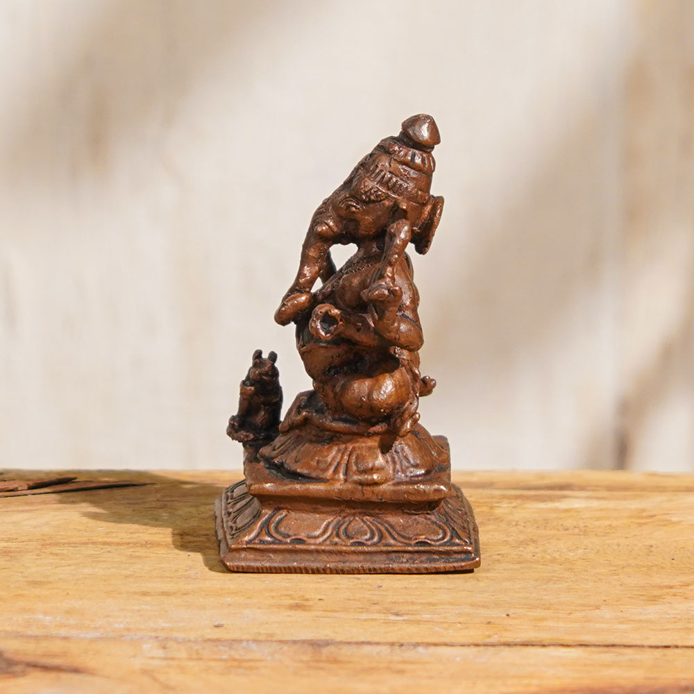 Buy this Lord Ganesha Murti online and invite the blessings of the elephant-headed deity into your home and heart. This exquisite copper statue of Lord Ganesha seated with his beloved vahana, the mouse known as Mushaka, is a masterpiece of craftsmanship. Handmade by skilled artisans, this idol of Lord Ganesha is made with intricate details that capture the divine essence of the Hindu god of wisdom, prosperity, and success. Made of high-quality copper, which is believed to be an auspicious metal in Hindu culture, this Lord Ganesha statue is not only a sacred symbol for worship, but also a beautiful piece of art that can enhance any space with its divine presence. Lord Ganesha is widely revered and worshipped in many Indian temples and homes, and this exquisite statue is a perfect addition to your prayer room or home altar. This Lord Ganesha with Mushaka statue is a meaningful gift for special or festive occasions, symbolizing blessings of wisdom, prosperity, and success for your loved ones. With its exquisite craftsmanship and spiritual significance, this Indian god statue is a cherished addition to any home, offering the divine presence of Lord Ganesha in your life.