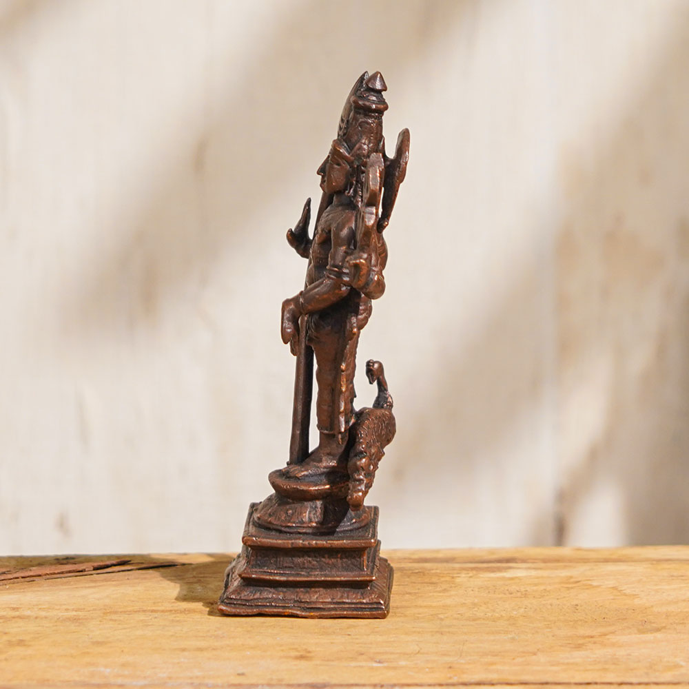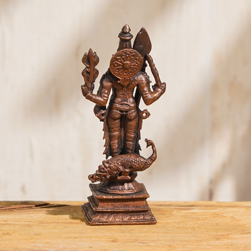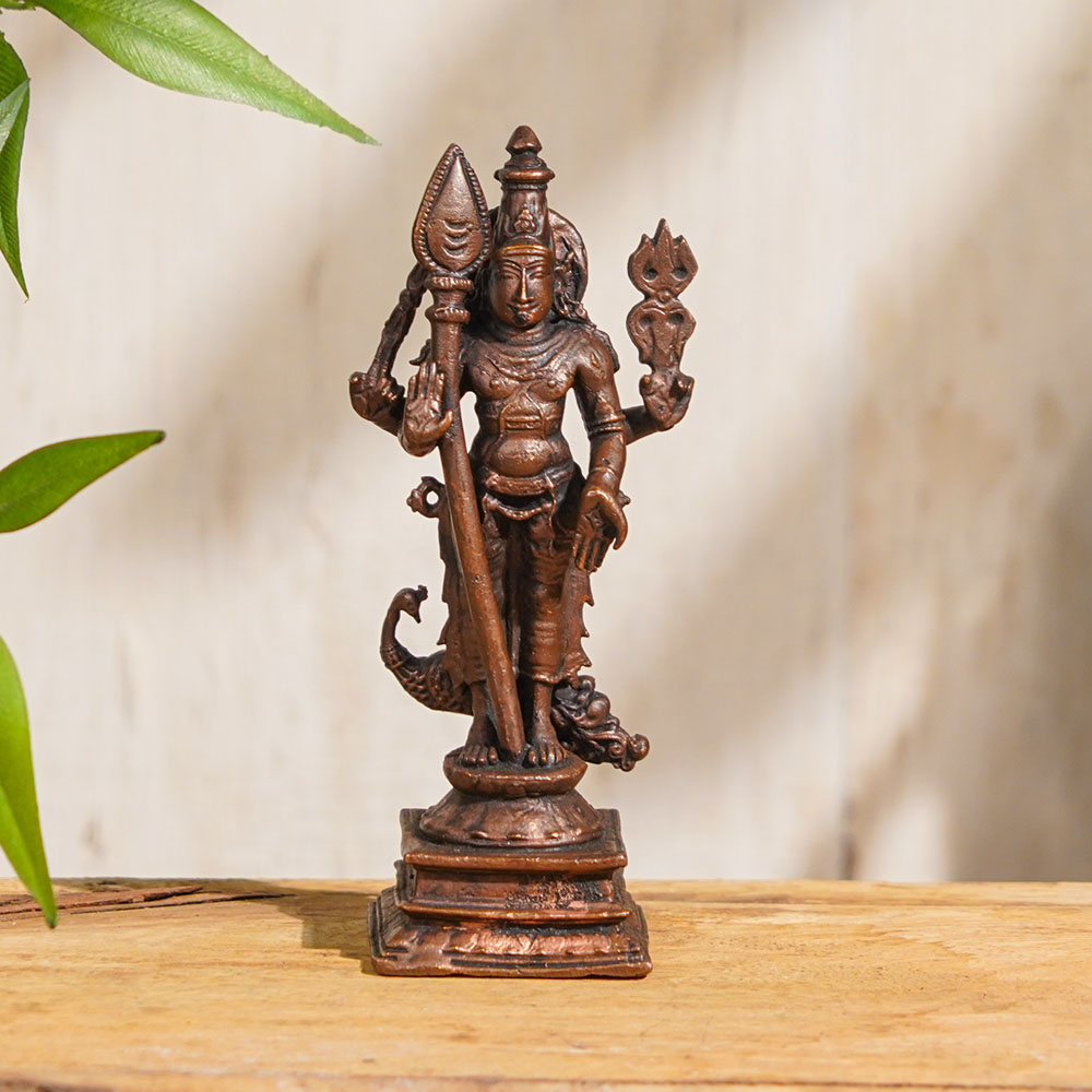 A stunning copper statue of Lord Kartikeya that is an exquisite work of art, skillfully handcrafted by skilled Indian artisans using high-quality copper, which is believed to be an auspicious metal. The statue depicts Lord Kartikeya standing, also spelled as Karttikeya, representing his valiance and leadership. It is a perfect addition to your home or office prayer room, and it can also be used as a decor piece or a unique collectible item. Lord Kartikeya is known as the god of war, wisdom, and courage. His divine presence is believed to bring good fortune and prosperity to one's life. You can easily buy Lord Kartikeya idol online and use it for daily worship or any auspicious ceremonies. It is a perfect addition to your home temple, providing a sense of peace and spiritual fulfillment. The Lord Kartikeya Murti also makes a perfect gift for your loved ones on special occasions such as weddings, housewarming, and festivals. Owning this exquisite and divine god idol is a true blessing, providing a sense of tranquility and positivity to your surroundings.
