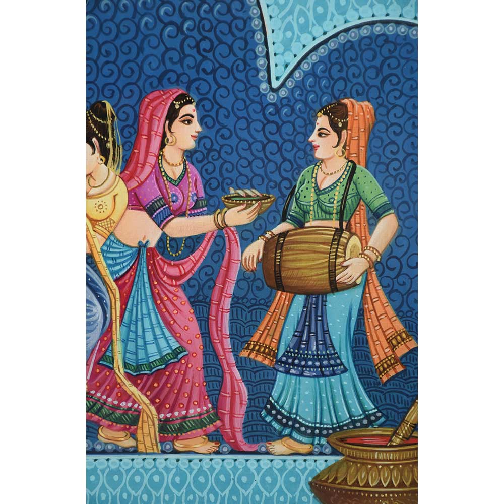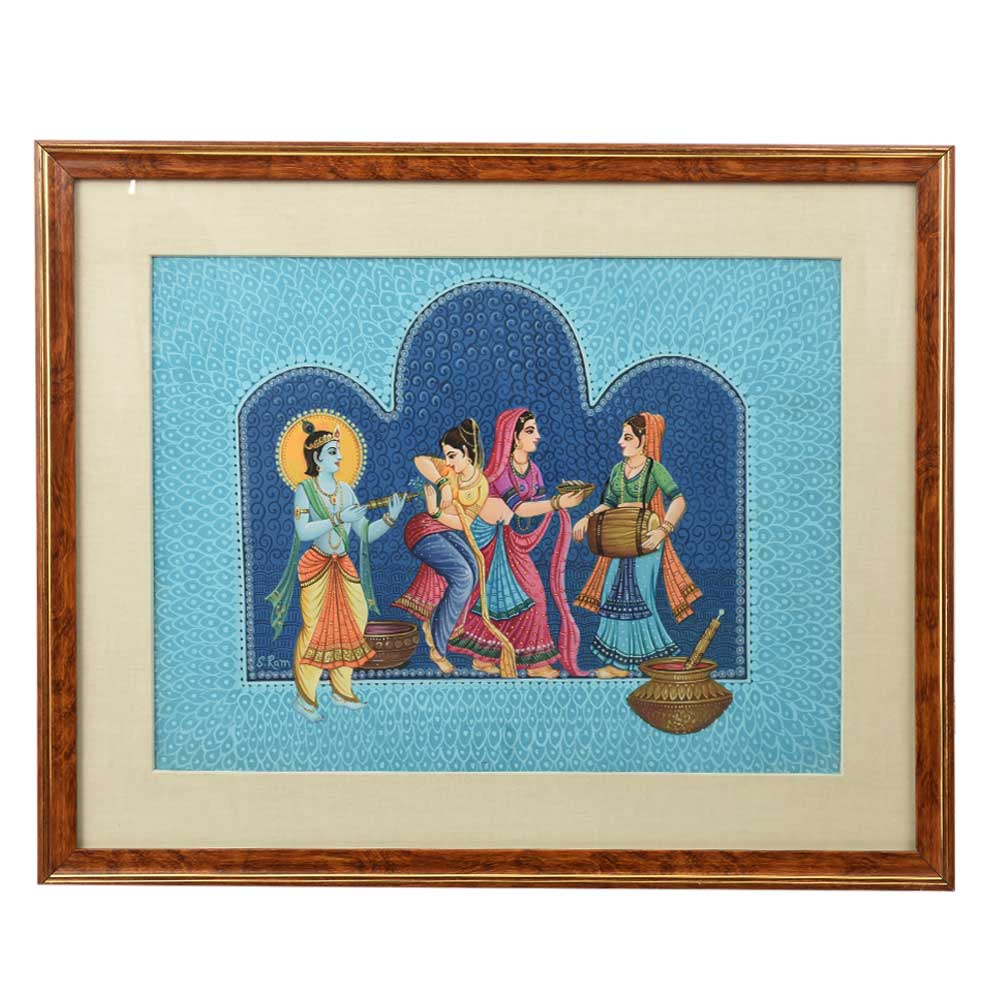 An impeccable Calendar Art Painting of the Divine Lord Krishna enjoying Holi with his gopis while they are playing the drums, dancing protecting themselves from Lord Krishna who is splashing water at them.