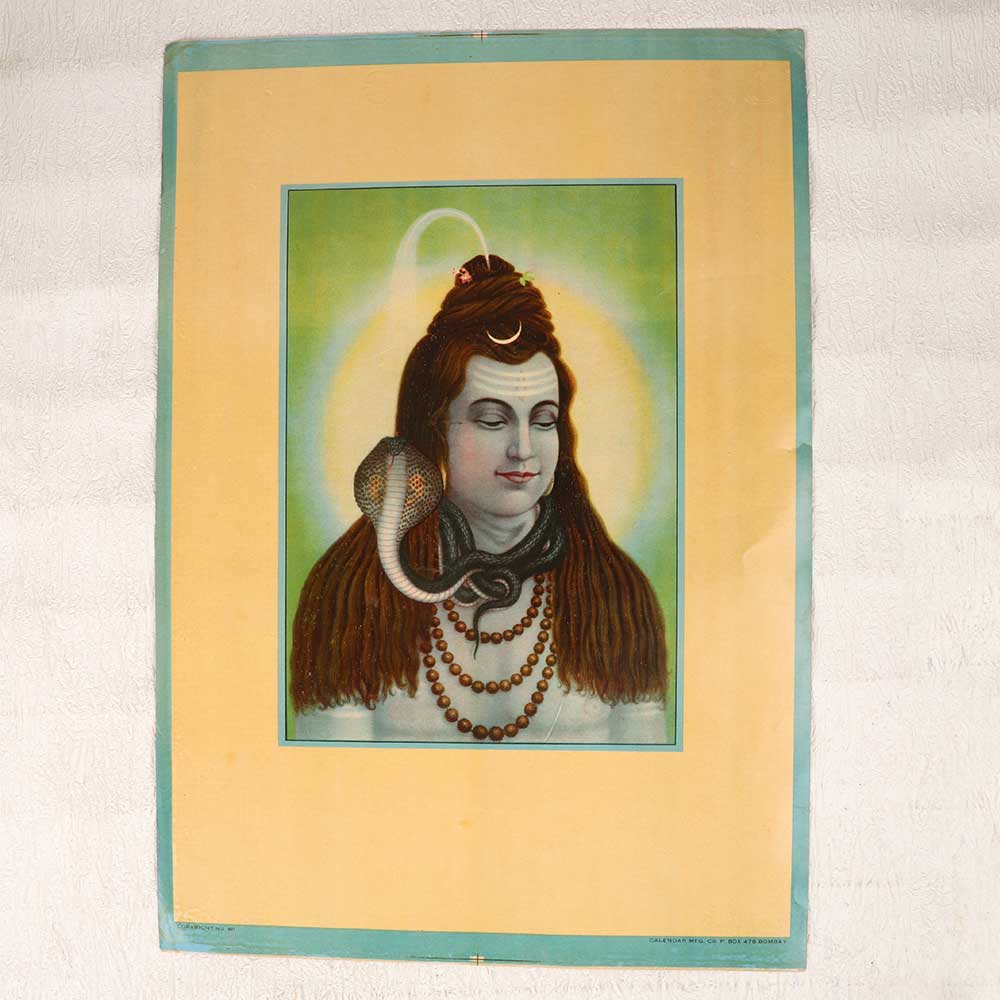 Feel the calming power of an ancient deity with this vintage oleograph print of Lord Shiva. Steeped in spirituality and artistic mastery, it makes a divine addition to any home. Lord Shiva sits in a serene yoga pose, snakes coiling around his neck and a crescent moon crowning his head. His hands form mystical mudras as he gazes forward in spiritual focus. This exquisite print immerses you in Hindu iconography and the mysticism of old India. Bring a piece of mesmerizing history into your home with this Shiva oleograph. Place it on your meditation altar to invite divine focus into practice. Or display it in your living room as an enchanting conversation piece. However, you use it, this vintage print infuses your space with tranquility and magic.